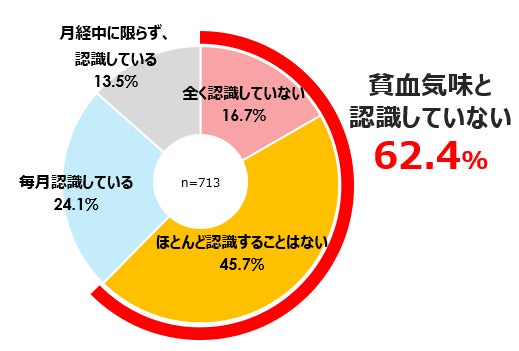 「貧血関連症状」がある人に、その原因として考えているものを聞いたところ「貧血」と認識している人は約3割にとどまりました。「血行不良」や「睡眠不足」が原因と考えている人も多く、「わからない」と回答した人も26.4%いることから、貧血関連症状に対して正しい対策が行われていない可能性が考えられます。また、月経中の貧血自覚の有無について聞いたところ、62.4%が「全く認識していない」(16.7%)、「ほとんど認識することはない」(45.7%)と回答しました。貧血関連症状があっても、貧血と認識している人は少数派であるといえます。