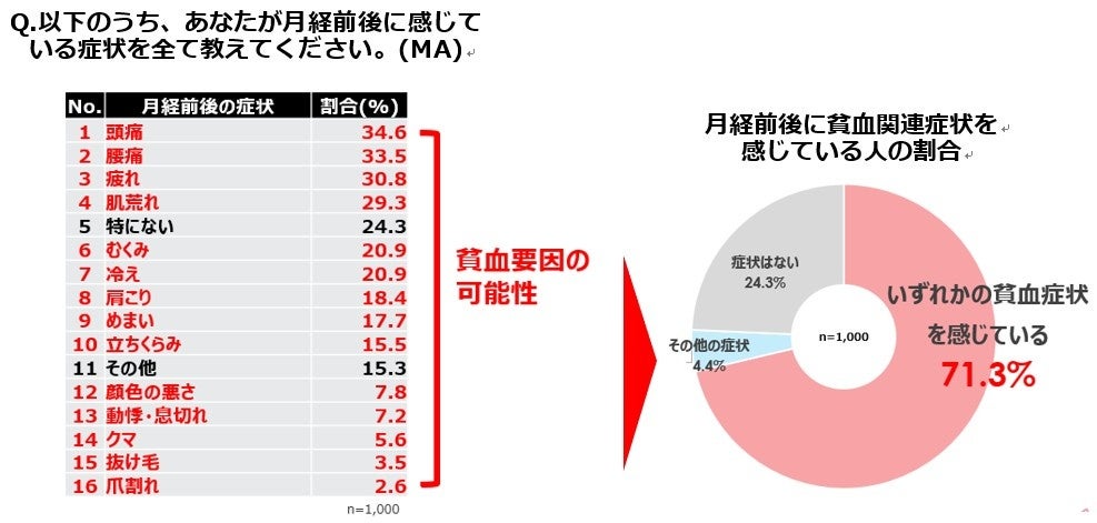 月経前後に感じる不調について聞いたところ、「頭痛」「腰痛」「疲れ」「肌荒れ」など様々な症状が挙がりました。実はこれらの多くは貧血が原因になっている可能性がある症状です。月経前後に感じる症状の中で、いずれかの「貧血関連症状」を選択した人は71.3%もいることが分かりました。7割以上の女性が貧血にともなう不調を感じている可能性があることが明らかになりました。