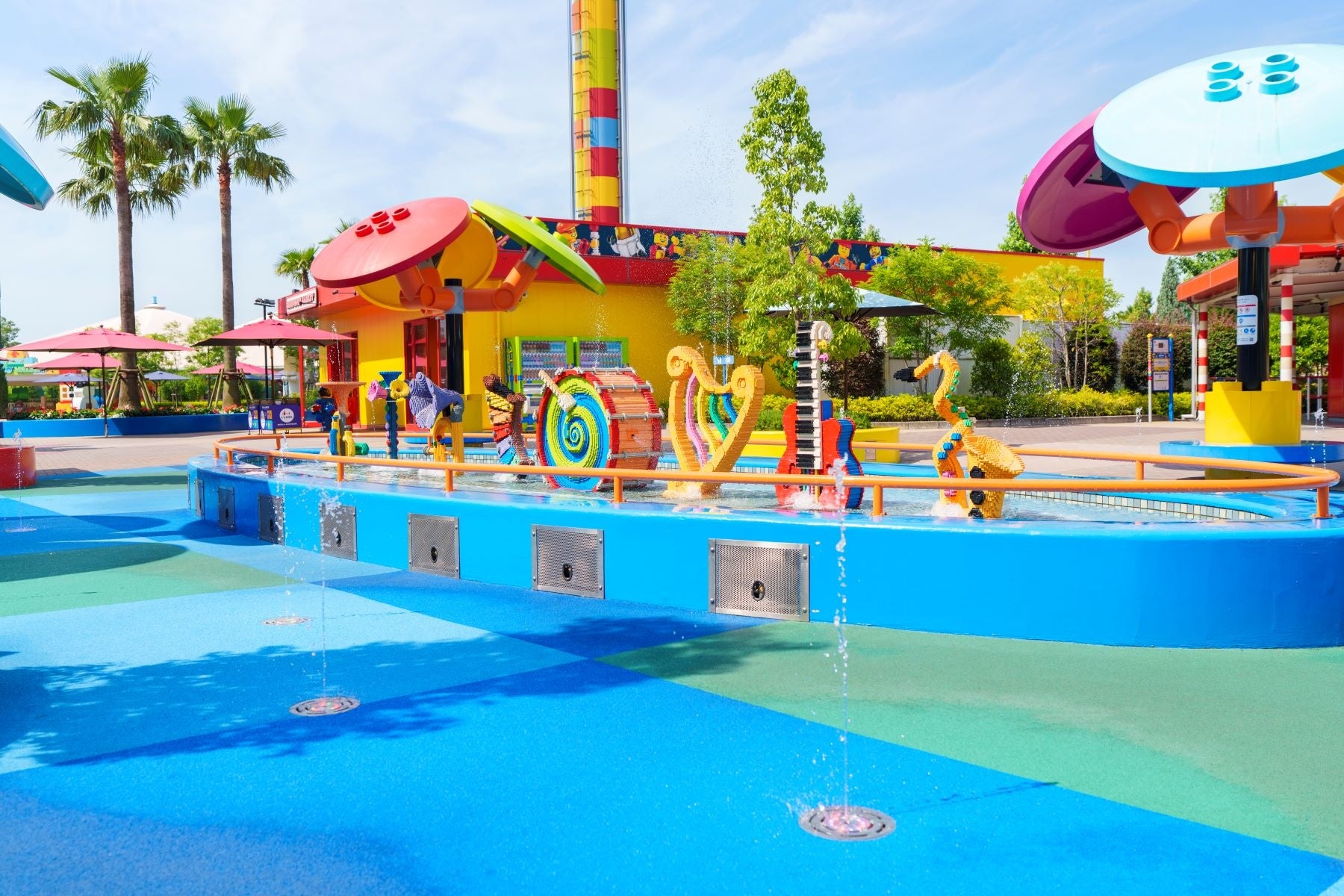 レゴⓇ ブロックで作られた楽器のモニュメントの前に立つと、様々なメロディーが流れる楽しい仕掛けの「ドレミでパチャチャ」。高さ約30~50cmの水柱が、ライトで色とりどりに照らされながらパチャパチャと吹き出し、視覚や聴覚で楽しめる水あそびエリアです。広さ260㎡のスペースは、小さなお子さまも安心して遊べるように、床面はゴムチップ入りの柔らかい素材でできており、飛び出す水を避けたり浴びたりしながら、親子で一緒に光と音の楽しい水あそびを満喫いただけます。
