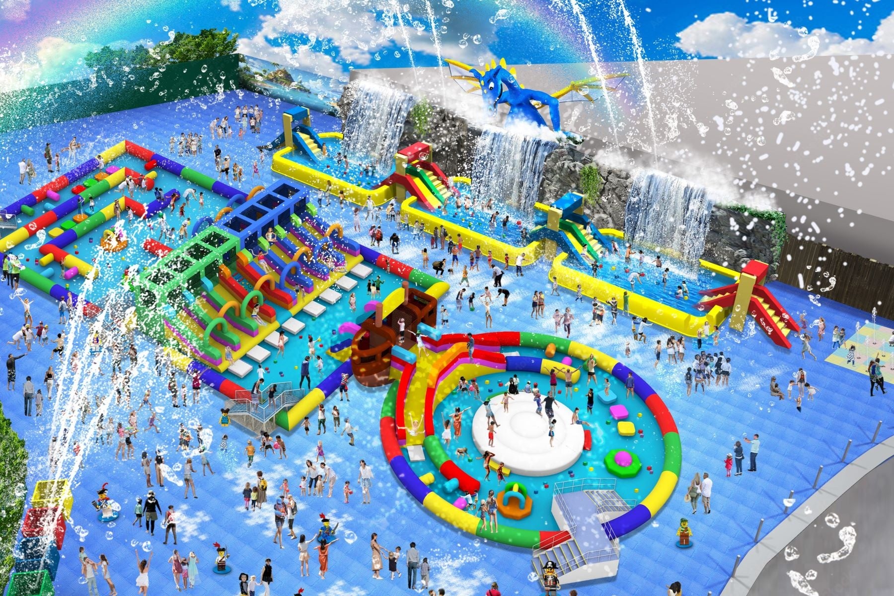今年の注目は、大人気の巨大水遊びゾーンがリニューアルした「ウォーター・メイズⅡ」。シンボルの“ブルードラゴン(レゴⓇ ブロック約32万個使用)”はそのままに、6つのゾーンが生まれ変わって新登場。ウォーターキャノンから水しぶきが飛び交う中、ドラゴンスライダーやぱちゃぱちゃひろばなど、計6つのゾーンをお楽しみいただけます。また、1日あたり約1,000人分のキャパシティを増やし、より多くのゲストに体験いただけるように進化した、ウォーター・メイズⅡは必見です。