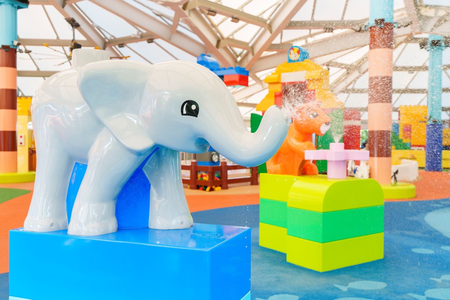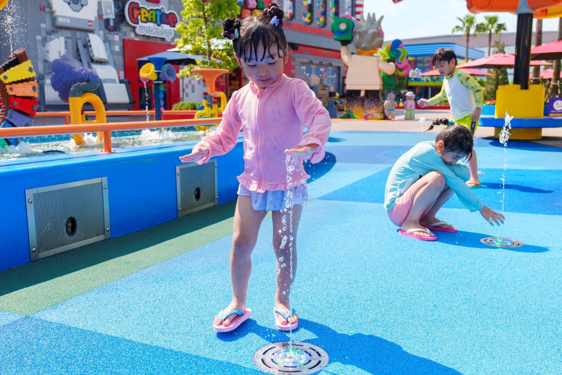 小さな子どもたちも安心して楽しめる、水深10cmの夏季限定のウォーターエリア。レゴⓇ ブロックをイメージしたすべり台やシャワーなど、水しぶきたっぷりの楽しい仕掛けが満載です。
