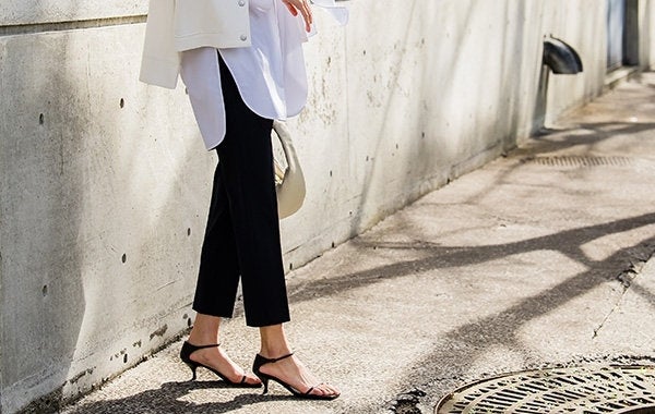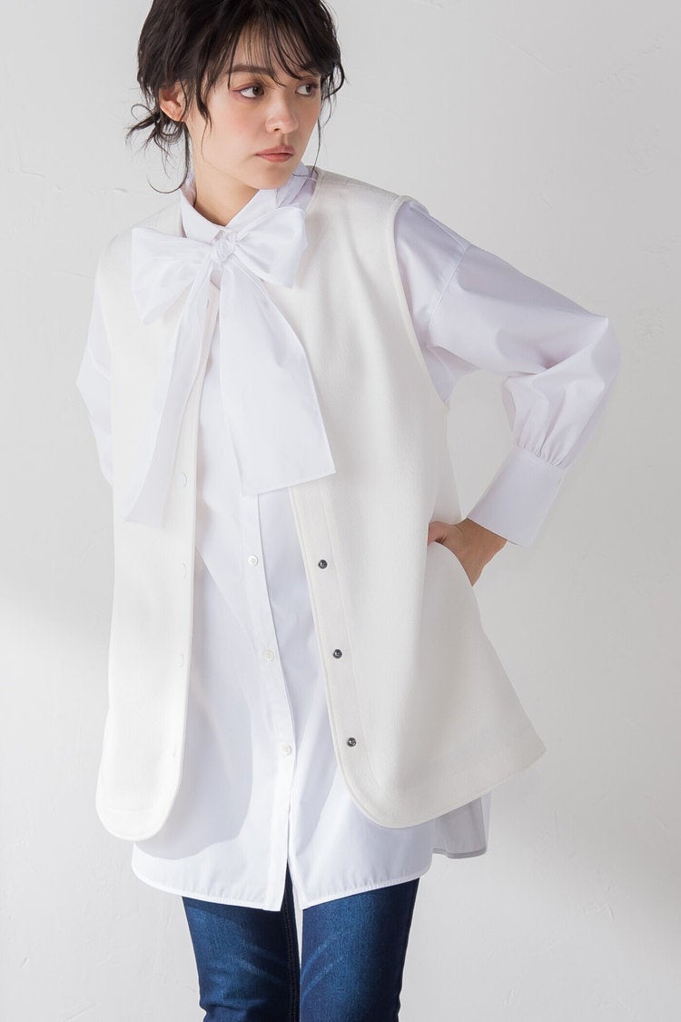 さりげなく映えるボウタイ付きの白シャツコーデでトレンド感もキープ。