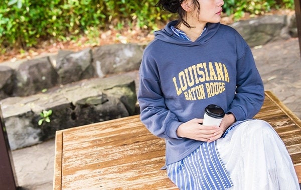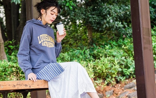 スウェットにシャツをレイヤードしたリラックスコーデ。