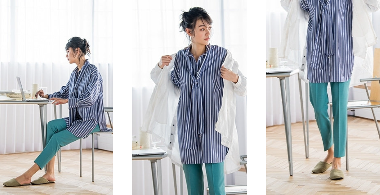 PC画面映えするストライプシャツとデスクワークも快適な4WAYストレッチのパンツ。
