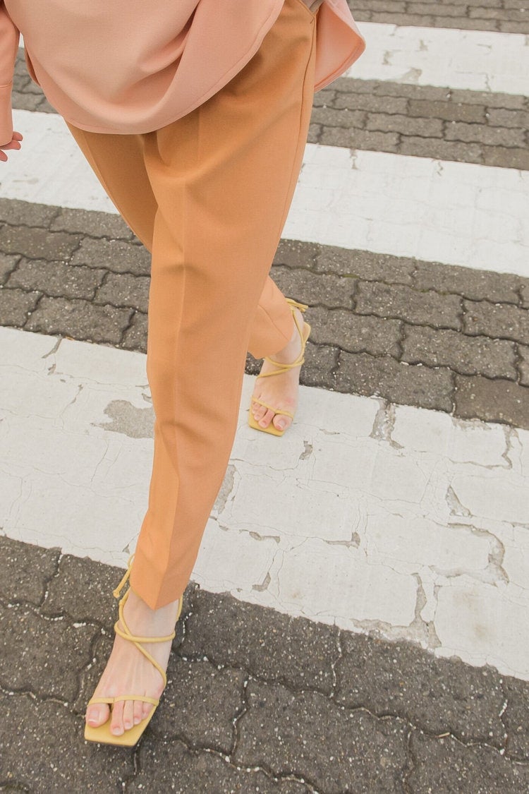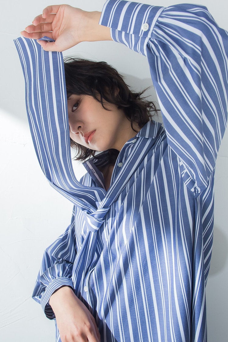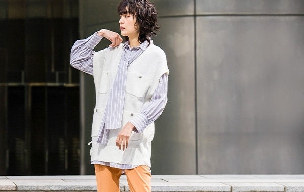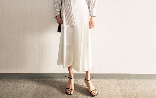 “叶えるパンツ”シリーズ、MIRANDAのプリーツとシャツのストライプ直線をリンクさせたスマートなコーデ。