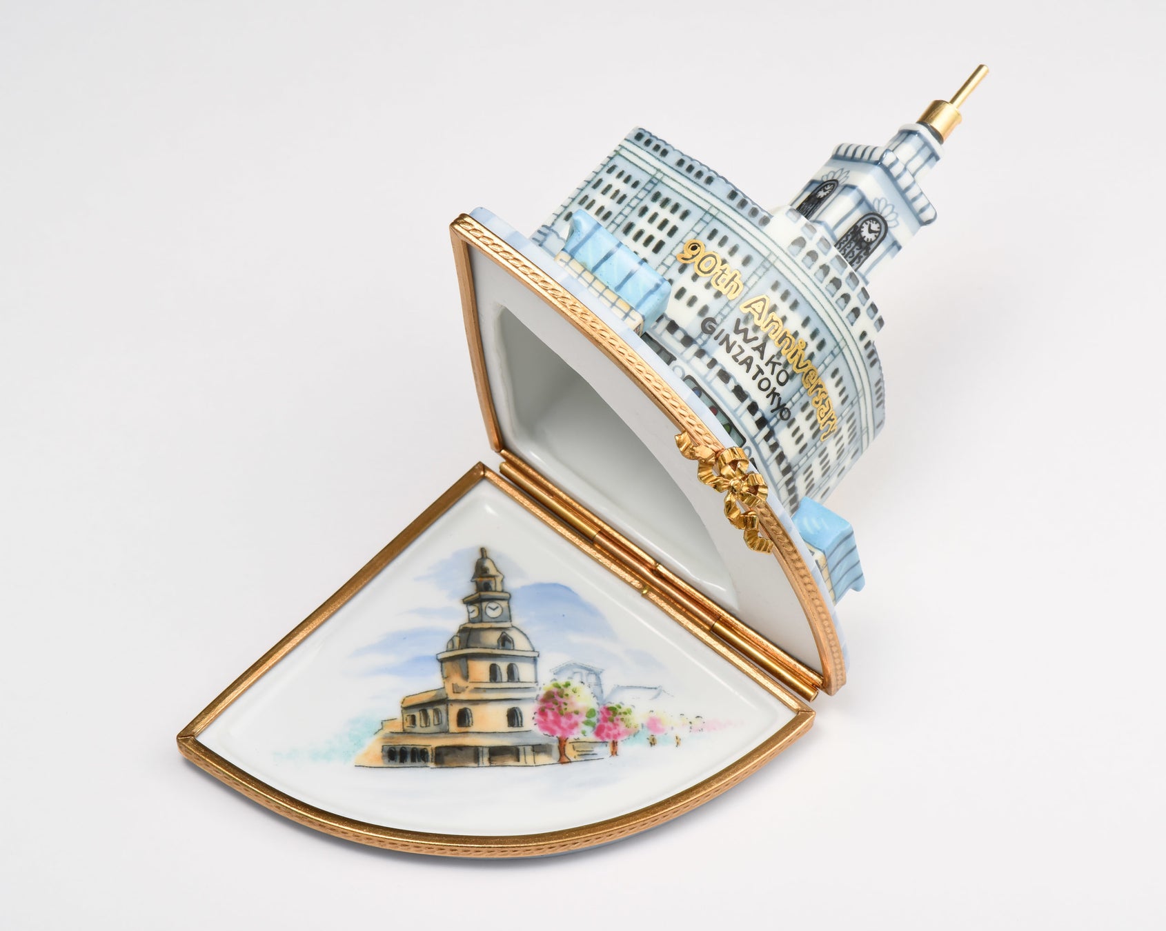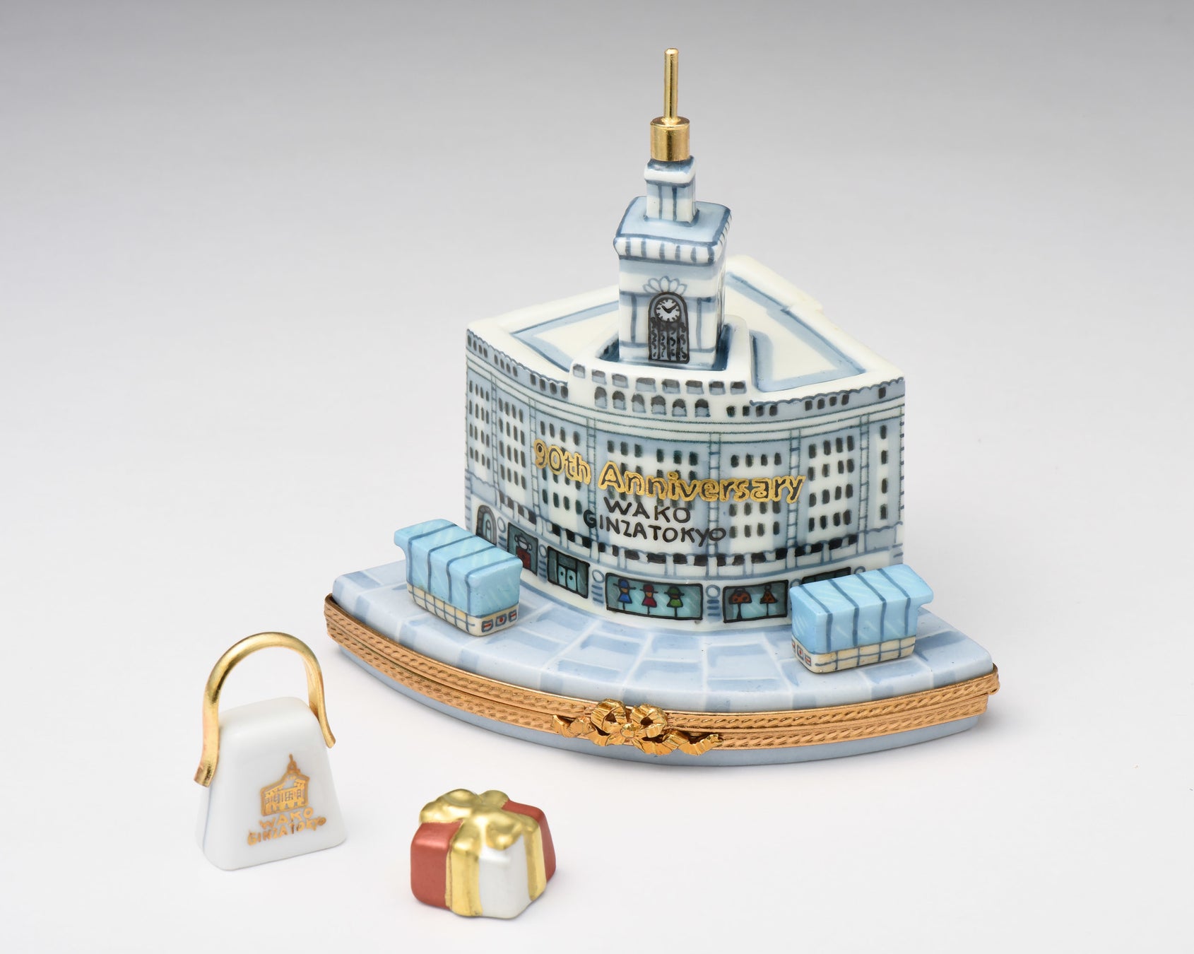フランス リモージュ地方で作られる愛らしい小箱「リモージュボックス」。フランス人は嗅ぎタバコや付けぼくろの収納等に使用していたようですが、現代ではコレクターズアイテムとして人気があります。本館をそのままリモージュボックスにしたデザインは「20**年限定デザイン」として制作してきましたが、「90TH ANNIVERSARY」の文字と、開けると見える初代時計塔のペイントは今回だけのスペシャル仕様です。中に入っているミニオブジェは、和光の紙袋とギフトボックスが付いています。
