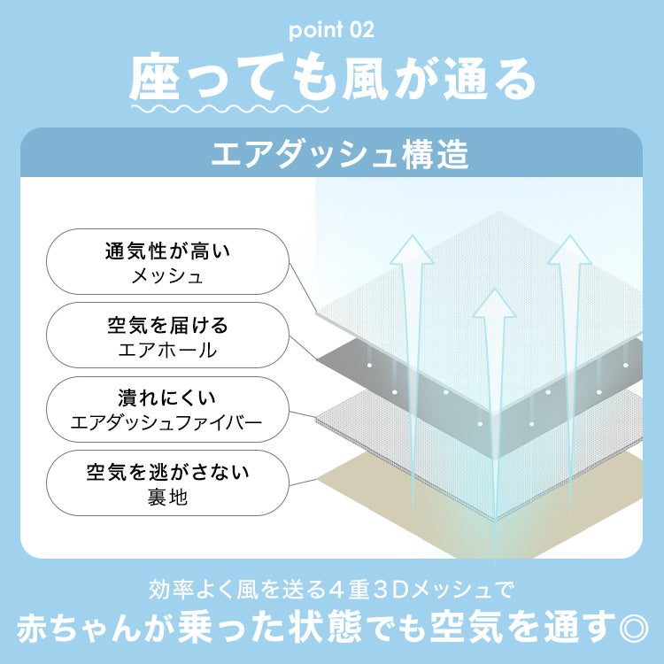 座っていても風が通るエアダッシュ構造になっており、4重3Dメッシュで赤ちゃんが乗った状態でも空気を通します。