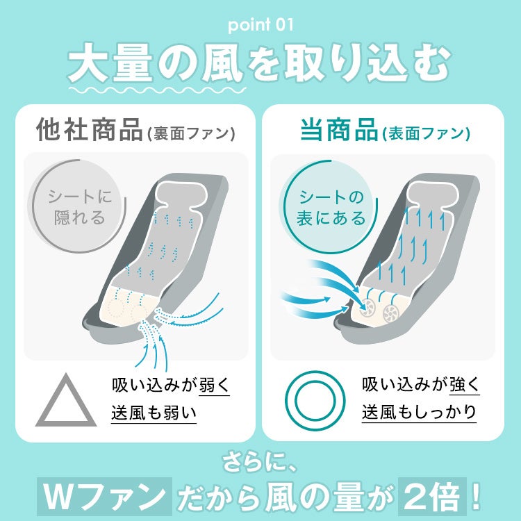 「ヒーミークール」はシートの前面にファンを取り付けているので、裏面ファンと比べると空気の取り込みを防ぐものがないため、スムーズな風送りが可能となっています。