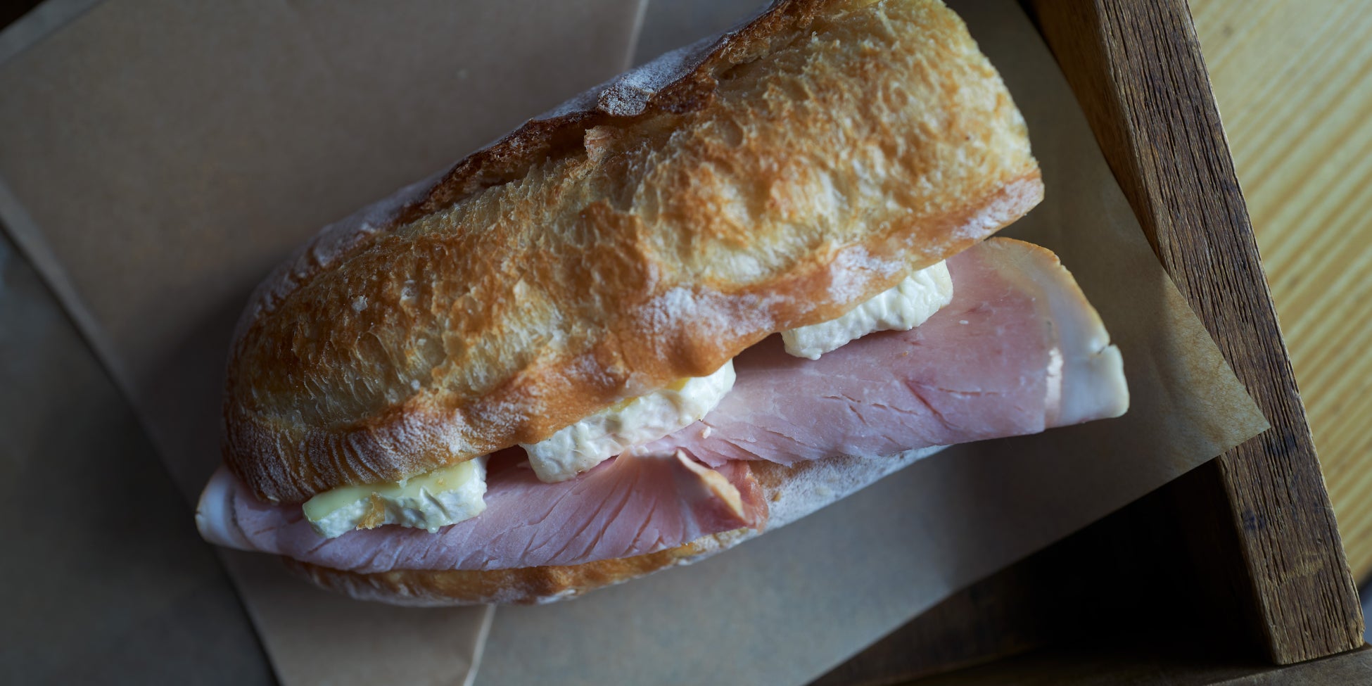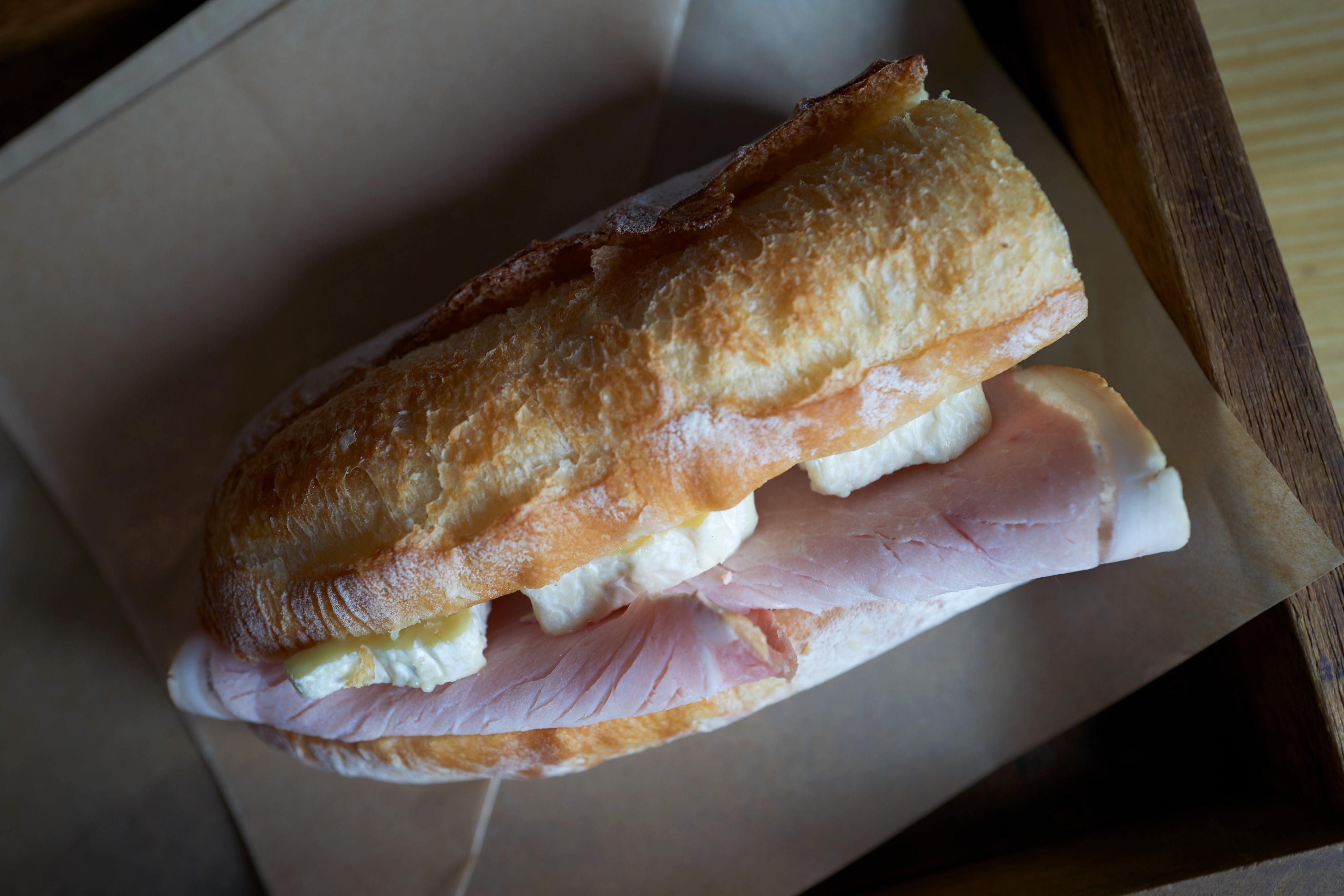 「猿田彦珈琲」のベーカリーブランド「オキーニョ」のバゲットでカマンベールチーズと「ケーニッヒ」のしっとりロースハムをサンドしました。