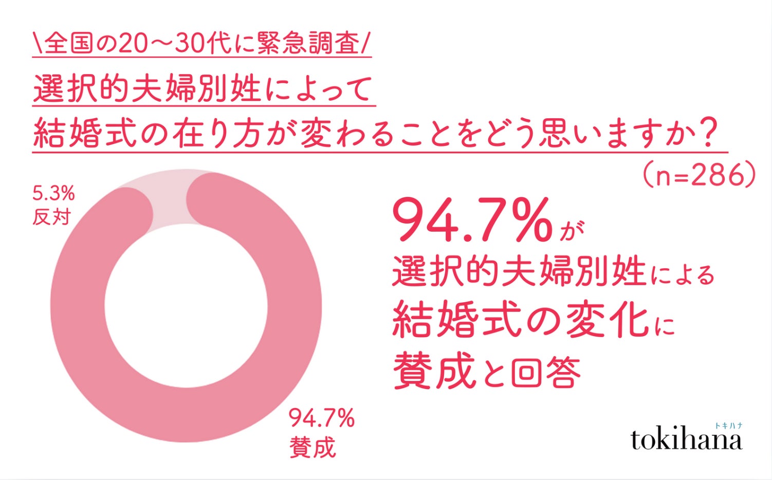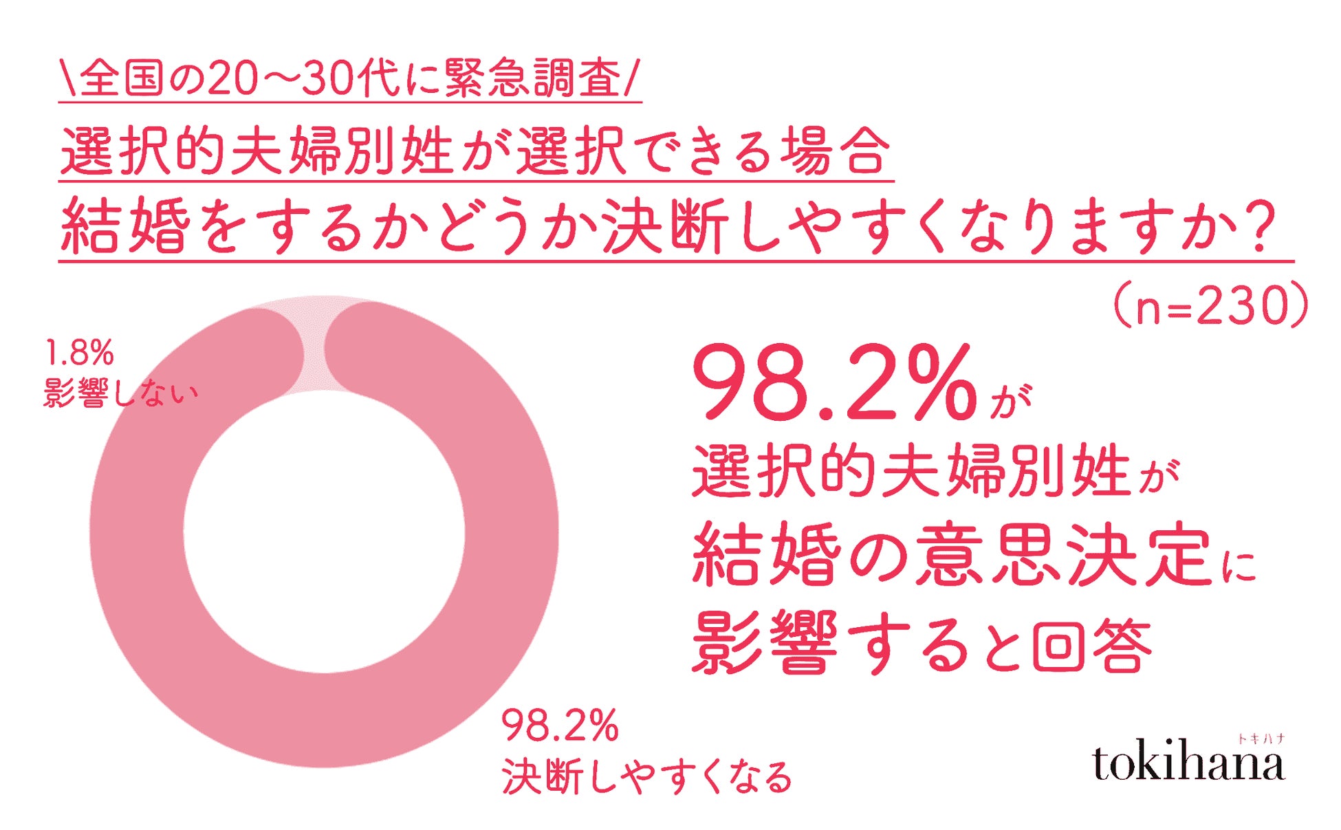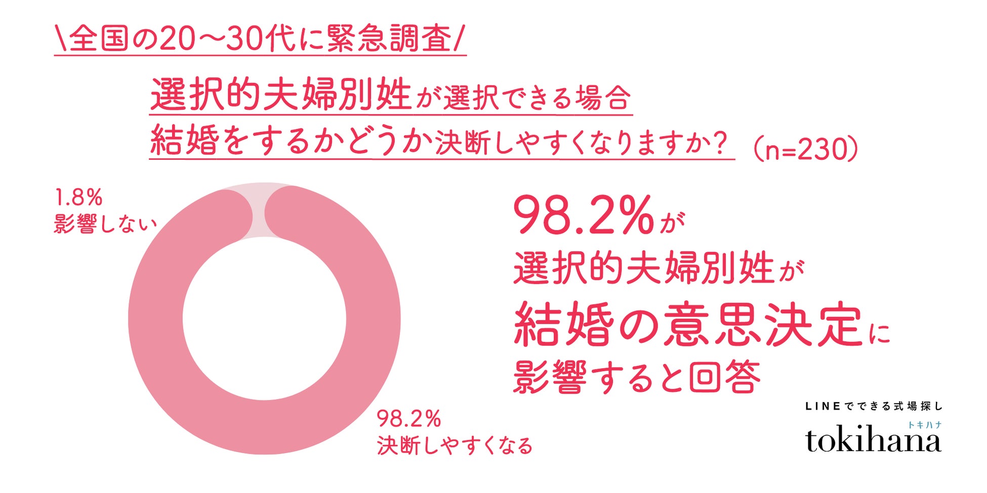LINEでできる式場探し『トキハナ(https://tokihana.net/)』を運営する株式会社トキハナ(本社:東京都港区、代表取締役社長:安藤正樹、以下 「トキハナ」)は、全国の20代〜30代の結婚式実施済もしくは実施予定者323名を対象にインターネット調査を実施した結果、選択的夫婦別姓導入によって、98.2%の人々が“結婚することを決断しやすくなる”ということが判明しました。