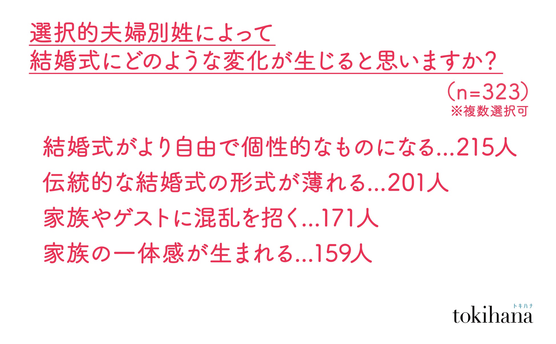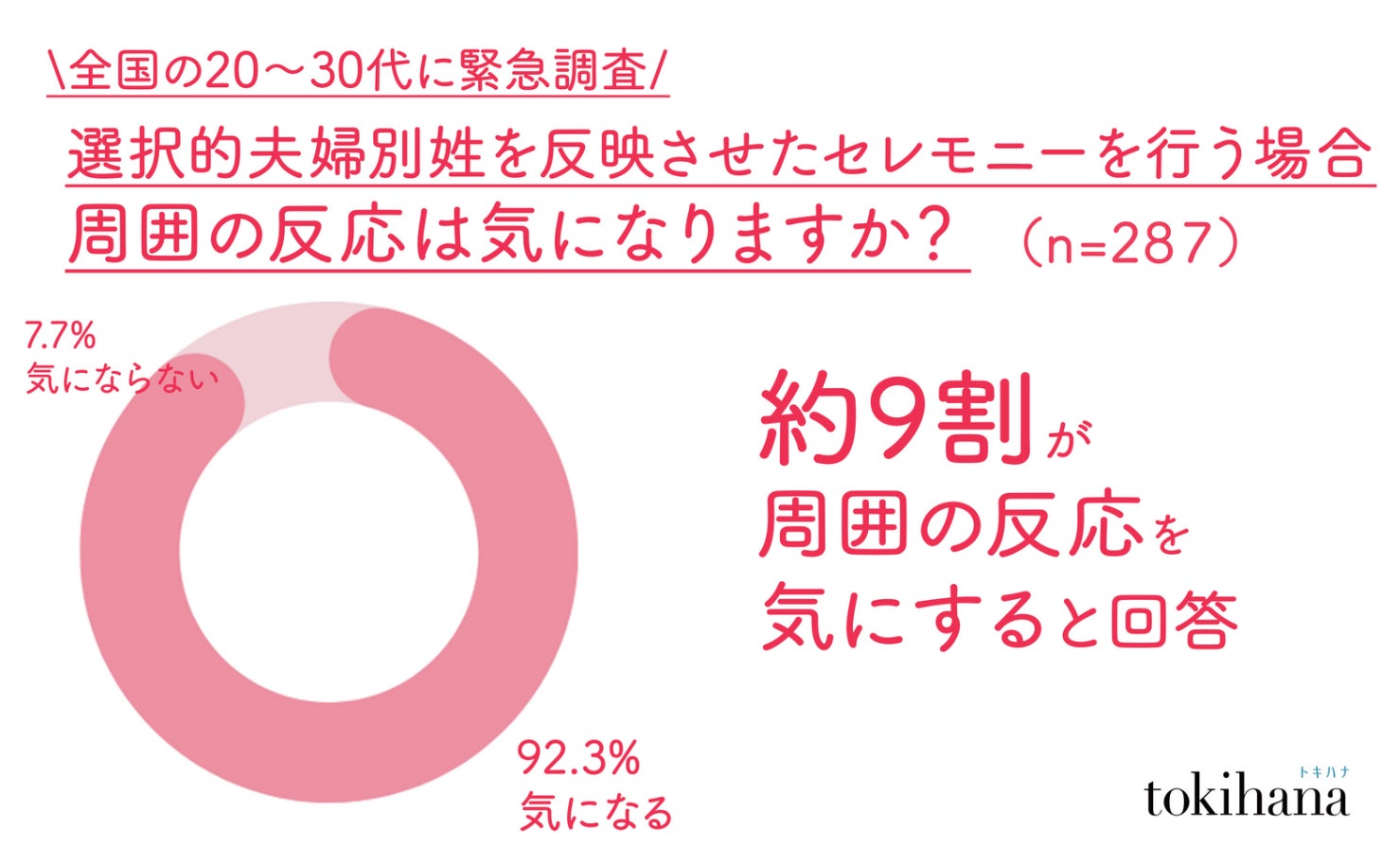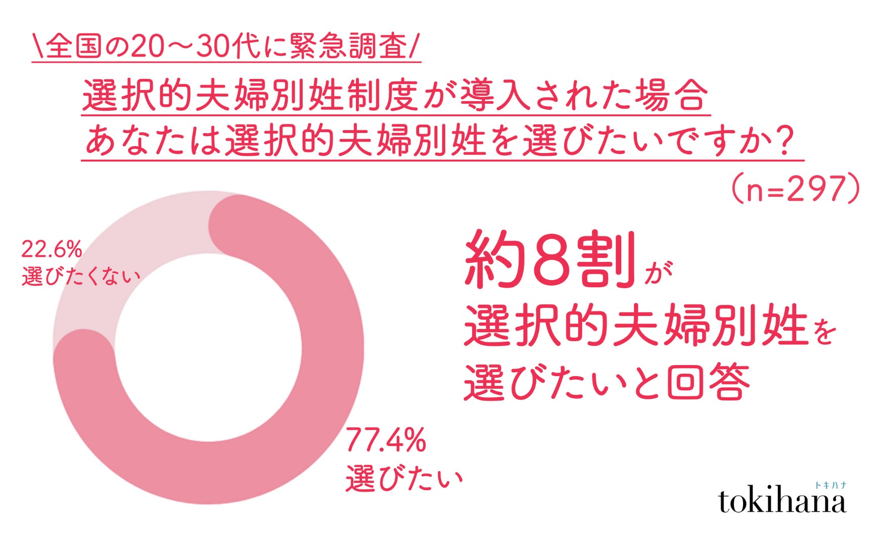 LINEでできる式場探し『トキハナ(https://tokihana.net/)』を運営する株式会社トキハナ(本社:東京都港区、代表取締役社長:安藤正樹、以下 「トキハナ」)は、全国の20代〜30代の結婚式実施済もしくは実施予定者323名を対象にインターネット調査を実施した結果、選択的夫婦別姓導入によって、98.2%の人々が“結婚することを決断しやすくなる”ということが判明しました。