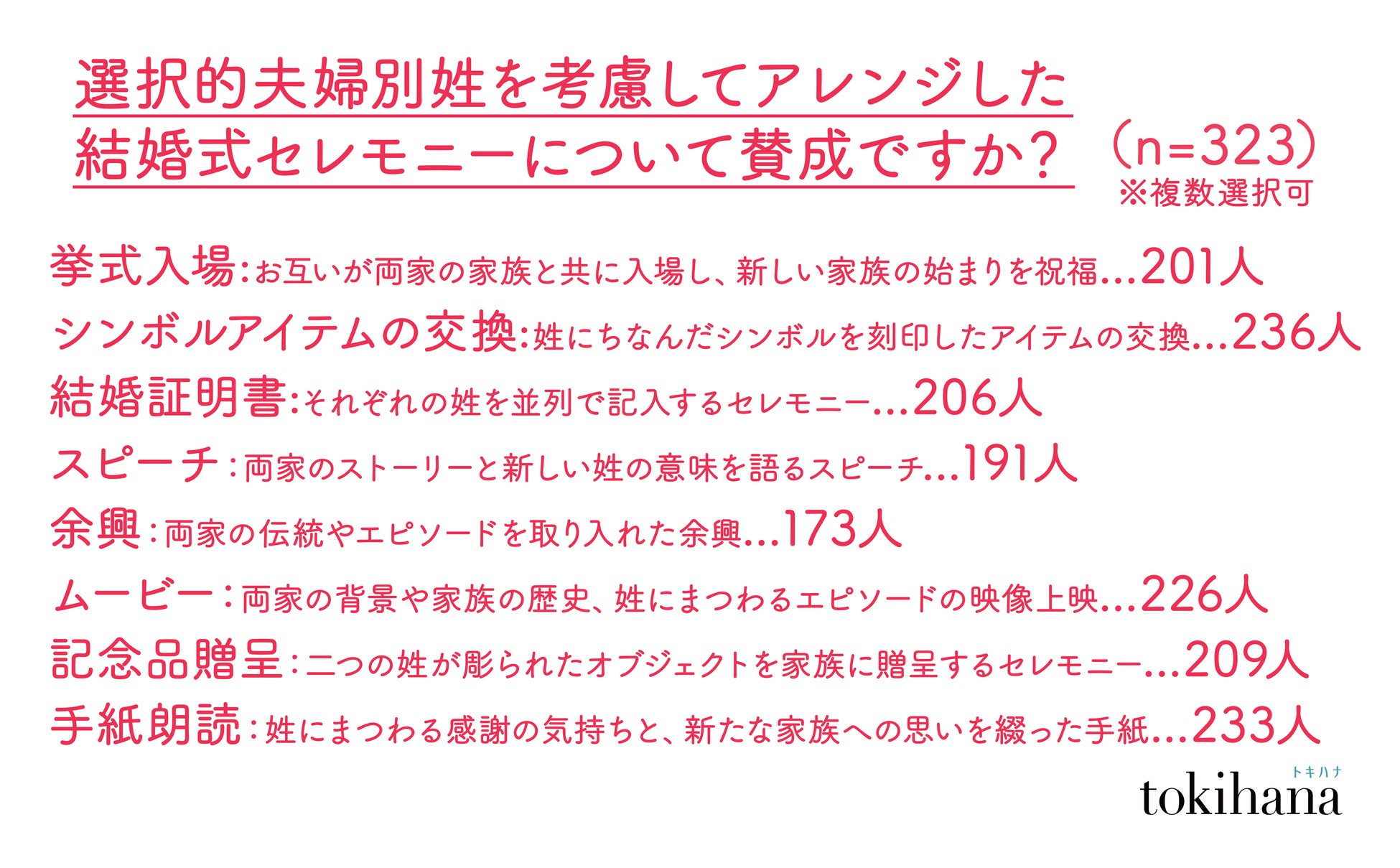 本リリースでは、選択的夫婦別姓がもし法制化された場合、選択的夫婦別姓に基づく結婚式セレモニーに対する賛否や社会的認識にどう影響するかについて探り、今後結婚式がどのように変化するか、調査結果を基に考察を行います。