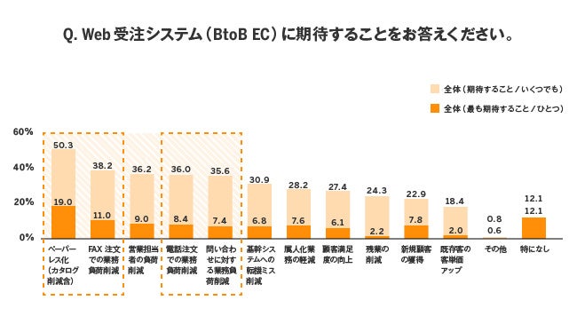 2. BtoB ECへの期待と、BtoB EC導入企業が導入後に感じている効果のうち、上位5項目中4項目が一致 (複数回答可)。電話・FAX注文での業務負荷削減をはじめ、期待通りの効果を実感していると見られる。
