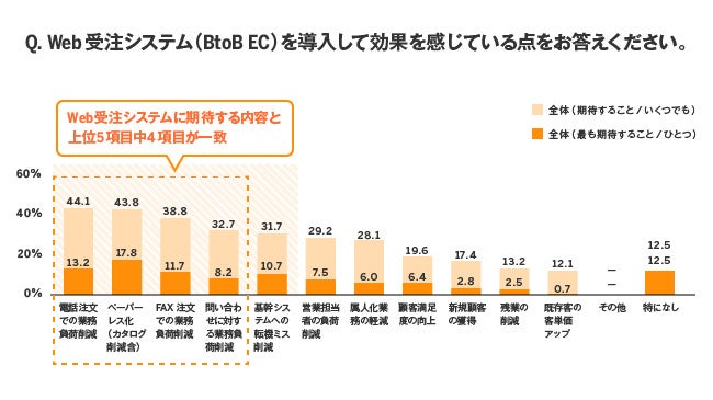 さらにBtoB EC導入企業では、BtoB ECへの期待と導入後に感じている効果のうち、上位に挙がっている項目が一致し、期待通りの効果が得られていると見られます。