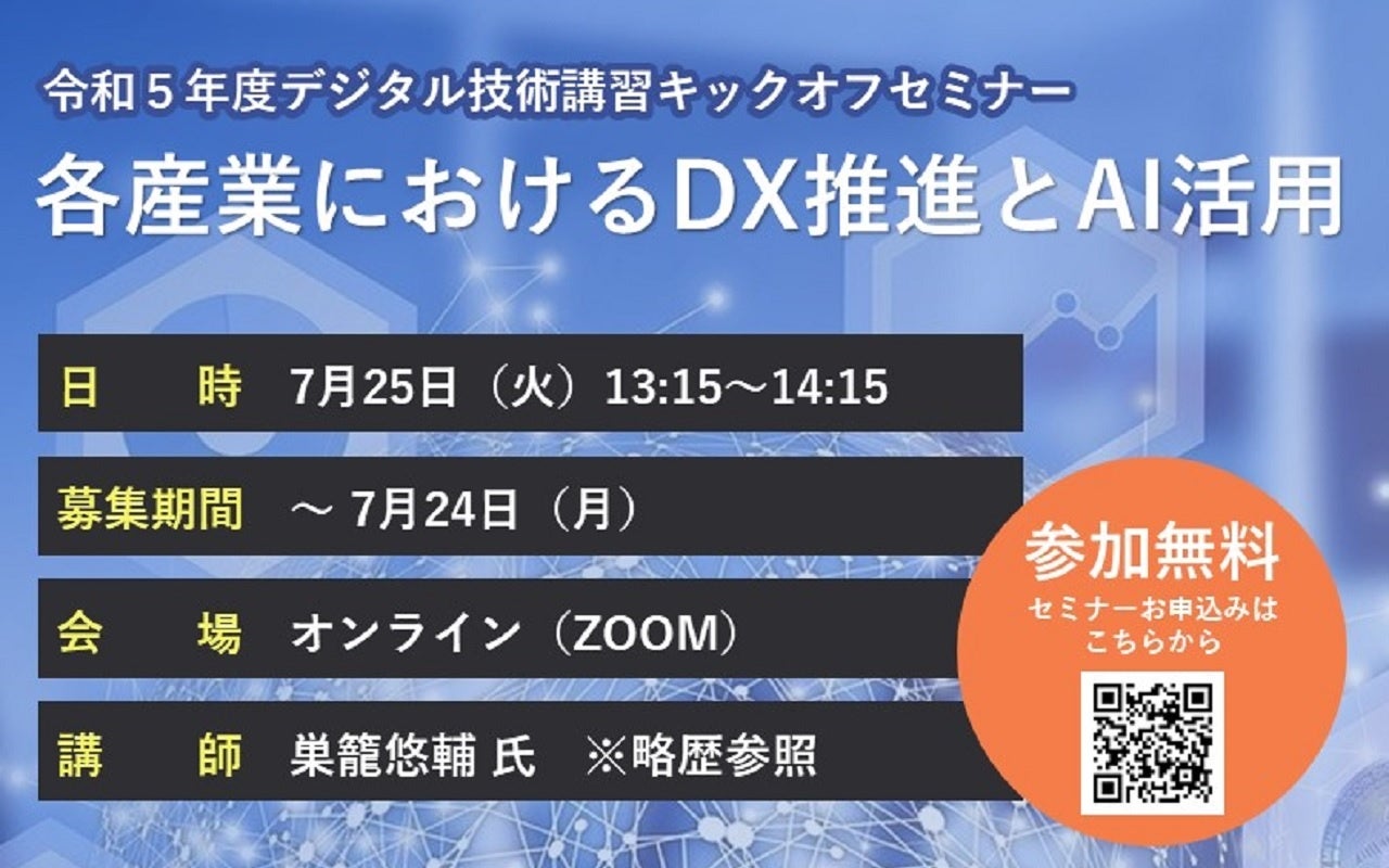 和歌山県内企業に向けたAIを導入するために必要となる実践的なスキルを身に着けていただく「デジタル技術講習」の開催に先立ち、当講座の告知イベントをセミナー形式で実施します。