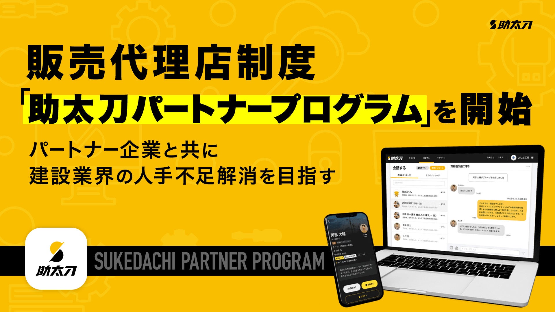 建設業界に従事する全ての人たちを支えるマッチングプラットフォーム「助太刀」を運営する株式会社助太刀(所在地:東京都新宿区、 代表取締役社長 兼CEO:我妻陽一 以下 「当社」)は、販売代理店制度「助太刀パートナープログラム」として、人手不足でお悩みの建設事業者様のご紹介、及び当社が提供する各種サービスの販売を担っていただくパートナー企業様の募集を開始いたしました。