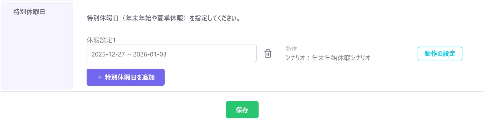 通常の週間スケジュールとは別に、年末年始、GW、夏季休暇などの特定期間を「特別休暇」として設定できるようになりました。 カレンダー上で日にち単位で指定でき、期間中は専用のシナリオを設定することが可能です。休暇前に手動で設定を切り替える手間がなくなり、設定漏れのリスクも解消します。