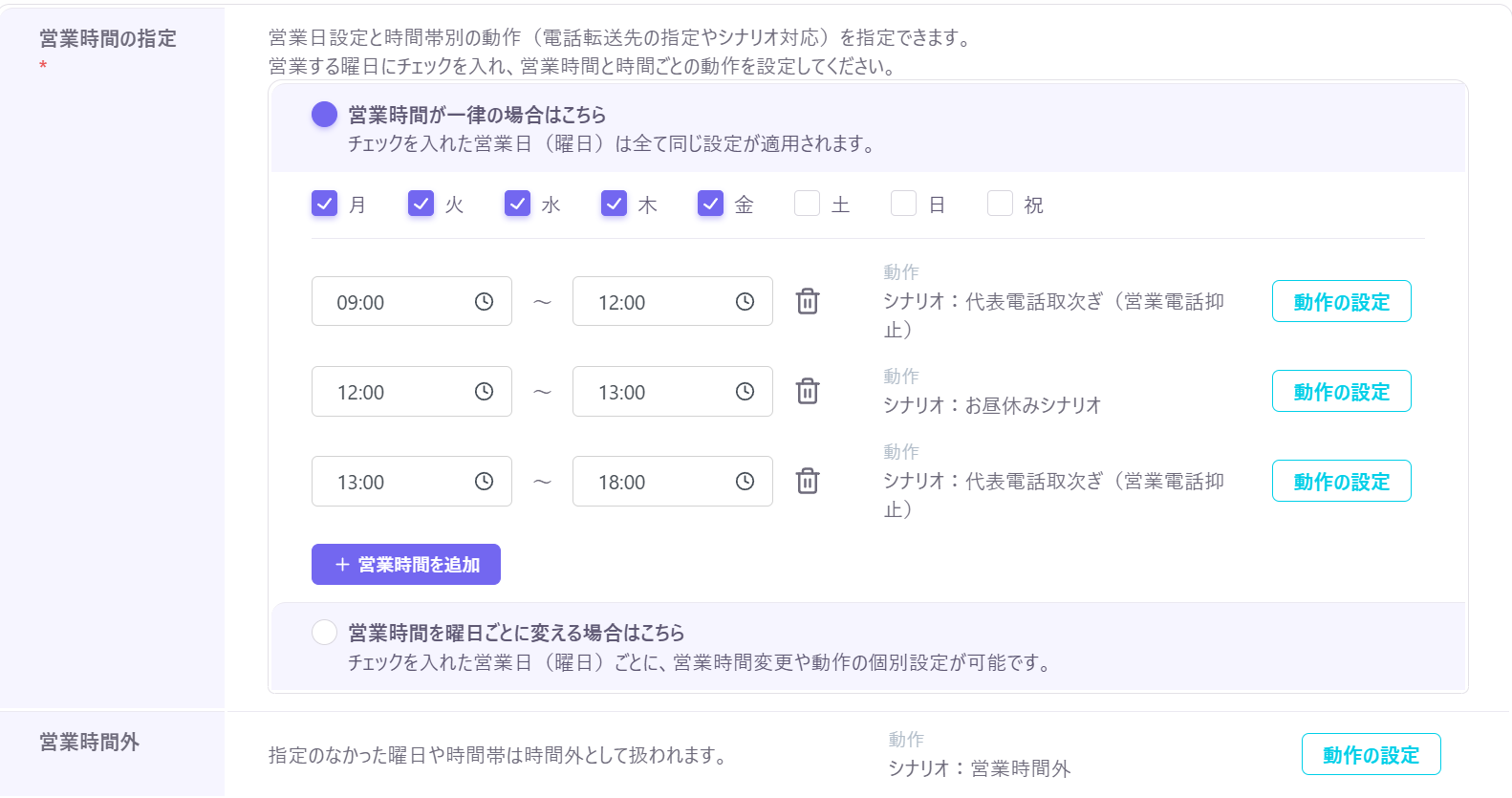 「平日は通常受付」「土日祝日は緊急窓口のみ案内」など、曜日ごとに異なる営業時間やシナリオを設定できるようになりました。