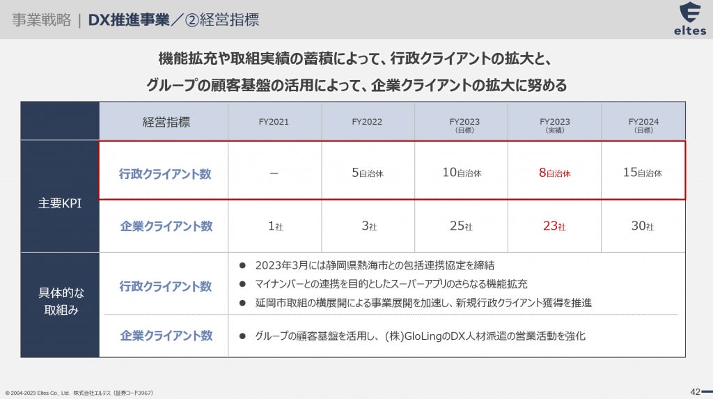 また、2023年6月時点で広域自治体を含む全国約60の自治体にサービスを提供していたプレイネクストラボのグループ参画によって、行政クライアント数は一気に増大しておりました。さらに両社の連携を進めた結果、2024年2月末の目標数値である15自治体を大きく上回り、行政クライアント数は、100を達成しました。