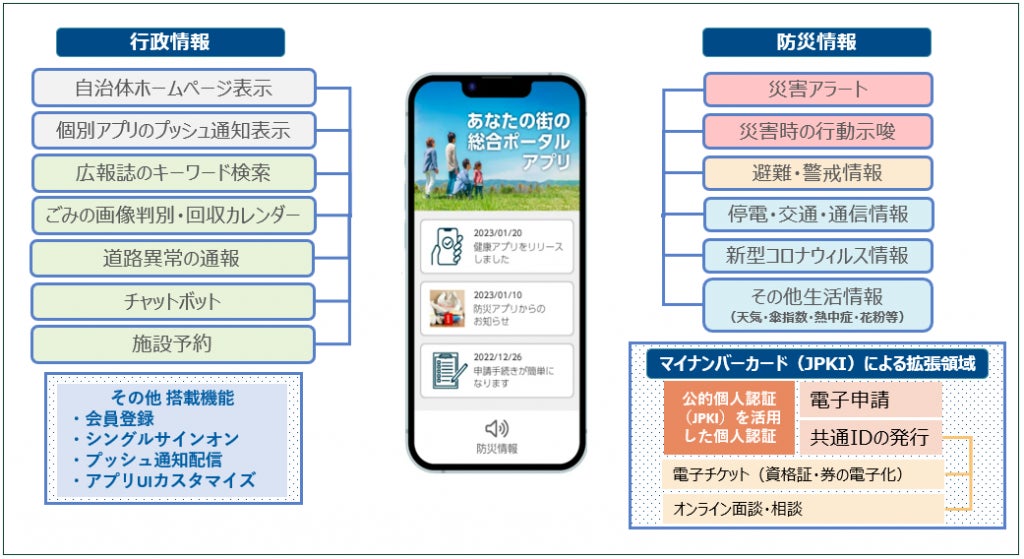自治体が住民に発信する情報・既存アプリ・Webサービス等を集約・一元化し、住民への情報発信力を格段に高めるアプリケーションです。既存アプリやWebサービスとのAPI接続によりシングルサインオンを実現し、住民の利便性が格段に向上することに加え、PUSH通知の統合などの管理機能により自治体職員の業務負担軽減も実現します。