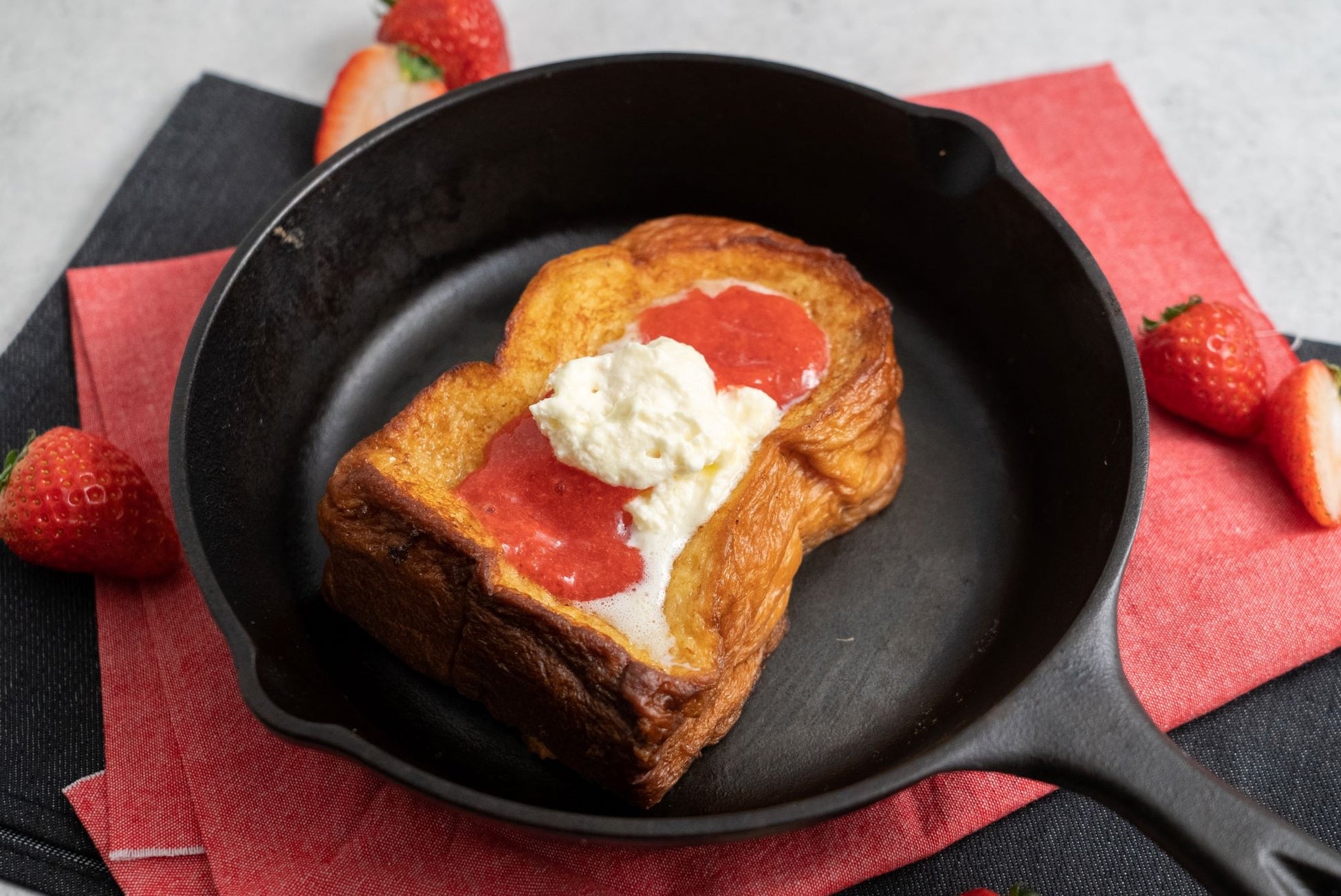 オンラインストアだけの限定メニューとしてご提供するのは、季節のフルーツを使って仕上げる、フルーツソース付きのフレンチトースト。今回は今が旬のいちごでご用意。ホイップバターと組み合わせるといちごの酸味とホイップバターの甘じょっぱい味わいが絶妙なバランスです。季節ごとに変わるこのソースも是非お楽しみください。