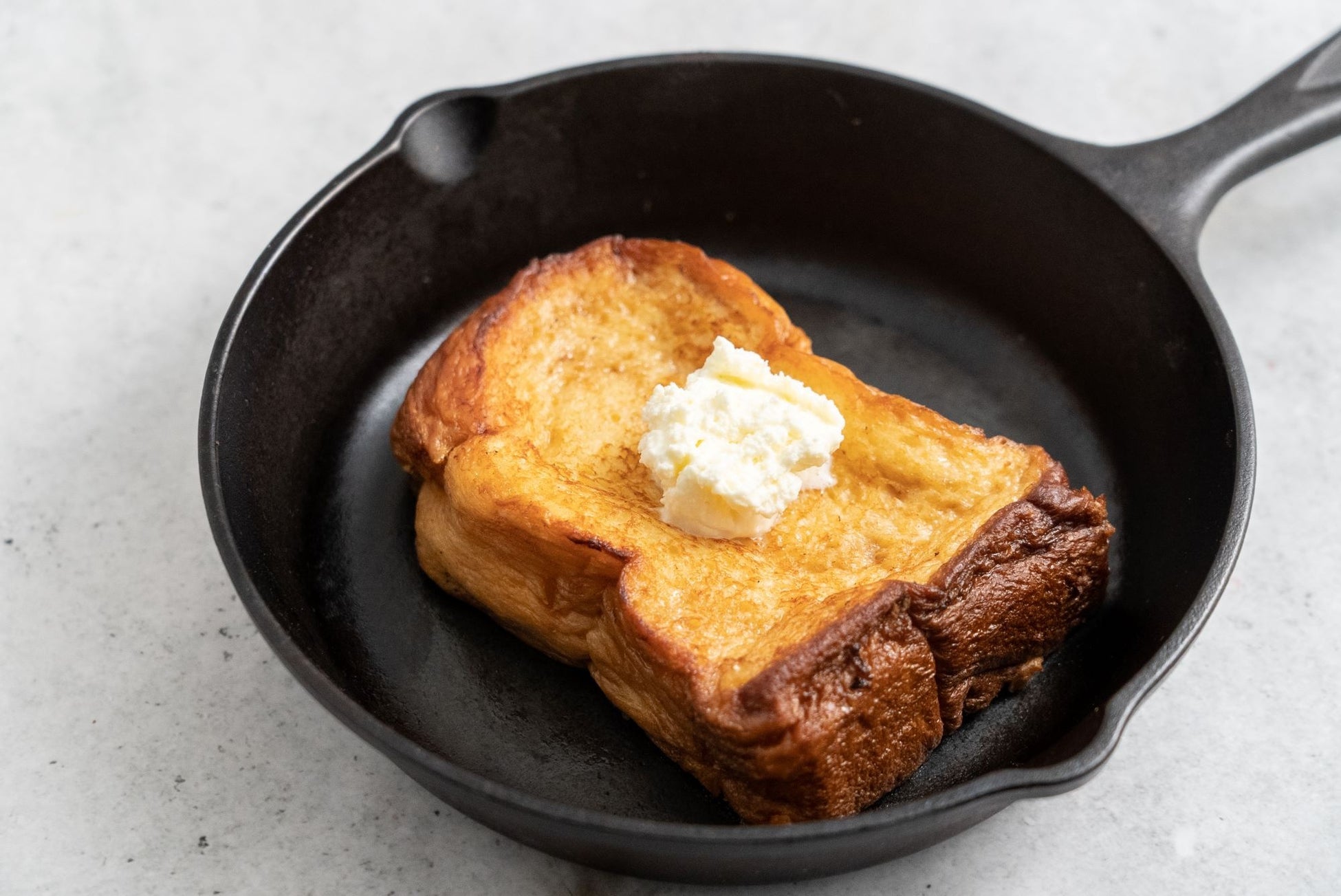 フレンチトーストに使うパンは、系列店のSHIBUichi BAKERY(シブイチ ベーカリー)で培ってきた製法で、このために開発したブリオッシュ生地。北海道産の厳選した小麦粉を2種ブレンドすることで北海道産小麦らしく、もちもち感のある引きの強い食感と自然な甘みをより引き立てます。改良を重ねて仕上げた生地に沁み込ませるアパレイユですが、漬け込む時間は12時間!5センチの厚さの生地に、中までしっかり沁み込ませるために冷蔵庫で寝かせるこの時間が重要です。