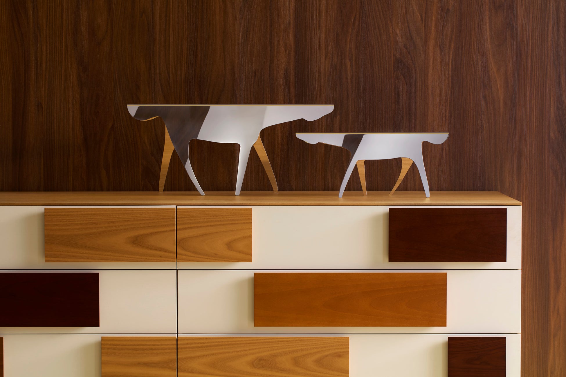 CAVALLO(馬)は、一枚の金属板をシンプルに折り曲げることで生まれた、折り紙のような造形のオブジェです。魔法のように命を吹き込まれたそのフォルムは、平らな素材を芸術へと昇華させるジオ・ポンティの卓越した才能を象徴しています。現在はステンレススチールで復刻されており、光沢のある質感が動物の躍動感を鮮やかに描き出します。