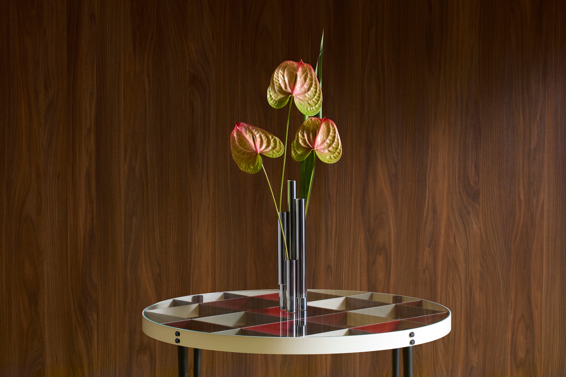 直径を揃えた7本の金属チューブを異なる高さで束ねた 7 TUBI は、大胆でタイムレスな構造体です。花器やキャンドルホルダー、あるいは純粋な彫像として、住空間に優雅に溶け込む高い汎用性を備えています。シンプルながらも物語性を感じさせるその姿は、時代を超えて未来を見据える、ジオ・ポンティの洗練された美学を象徴しています。