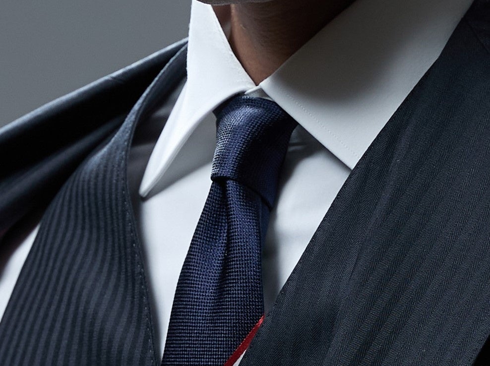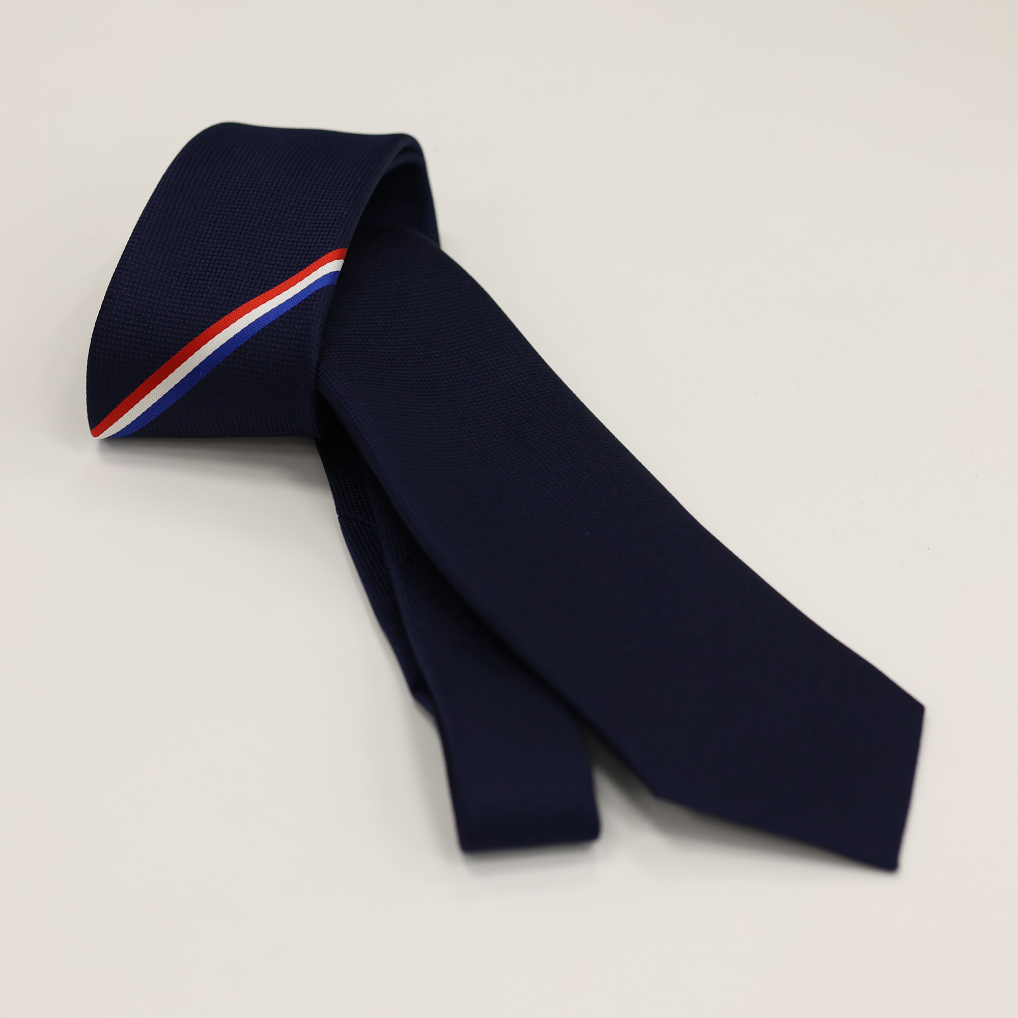 ネクタイ:シルク100%のネクタイは、チームカラーのトリコロールを大検に採用することによりシャープさを表現しました。