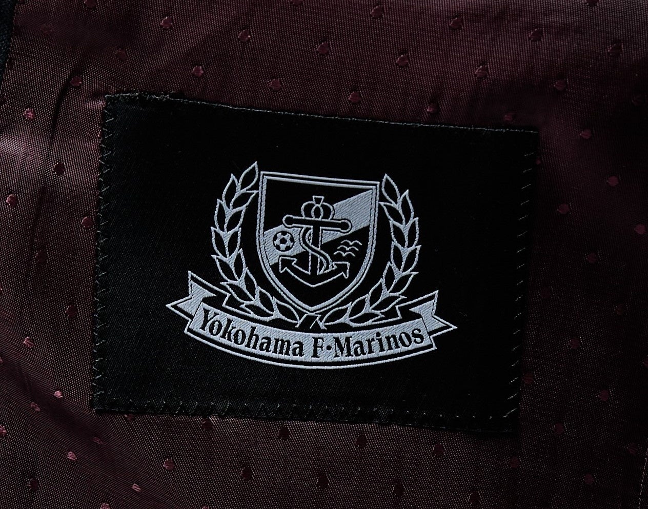 ジャケット:シングル2つ釦、「横浜F・マリノス」のエンブレムが刺繍された織ネームと、トリコロールのオリジナル衿吊りを採用