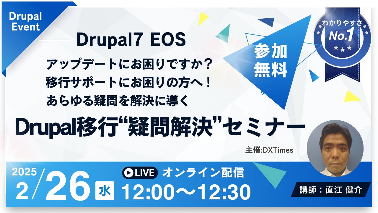 2025年2月26日、Drupal 7のサポート終了に伴い、現在Drupalを利用中の企業や開発者の皆様を対象に、【Drupal移行"疑問解決"セミナー】を開催いたします。