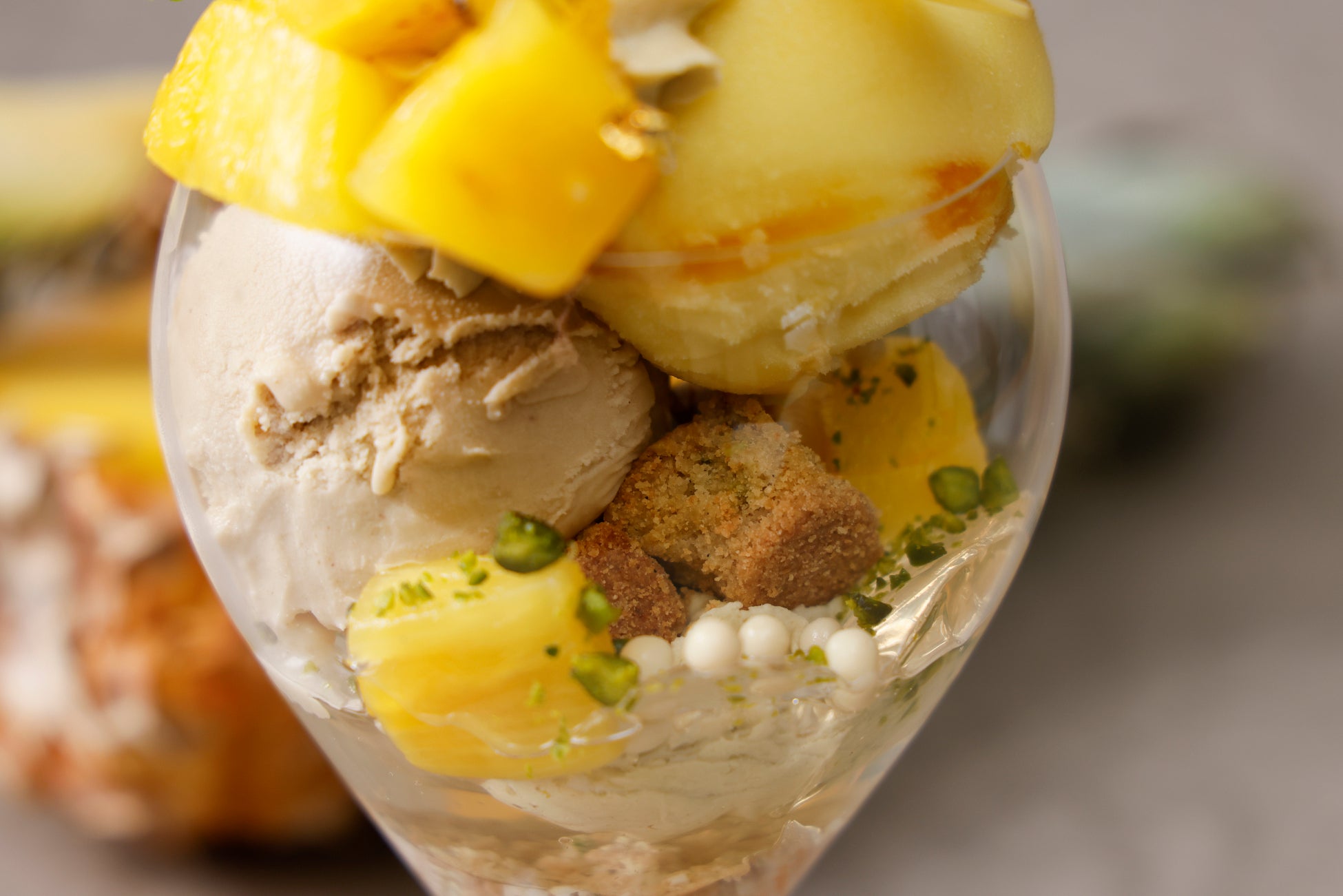 さっぱりと華やかなパインアイスと濃厚で香り高いピスタチオアイスを合わせ、ピスタチオのクッキーやピスタチオクリーム、
