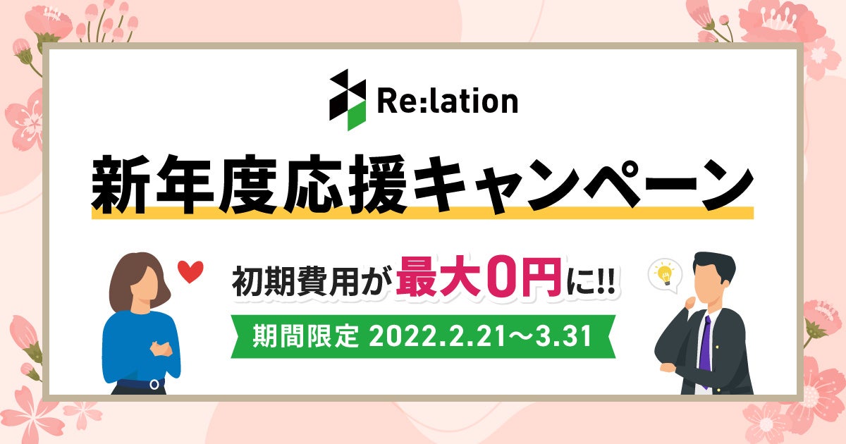 顧客対応クラウド『Re:lation (リレーション) 』を開発・提供する株式会社インゲージ(本社:大阪府大阪市、代表取締役:和田 哲也)は、2021年2月21日(月)から3月31日(木)まで、Re:lation新規契約時の初期費用が最大0円になるキャンペーンを実施しますのでご案内いたします。