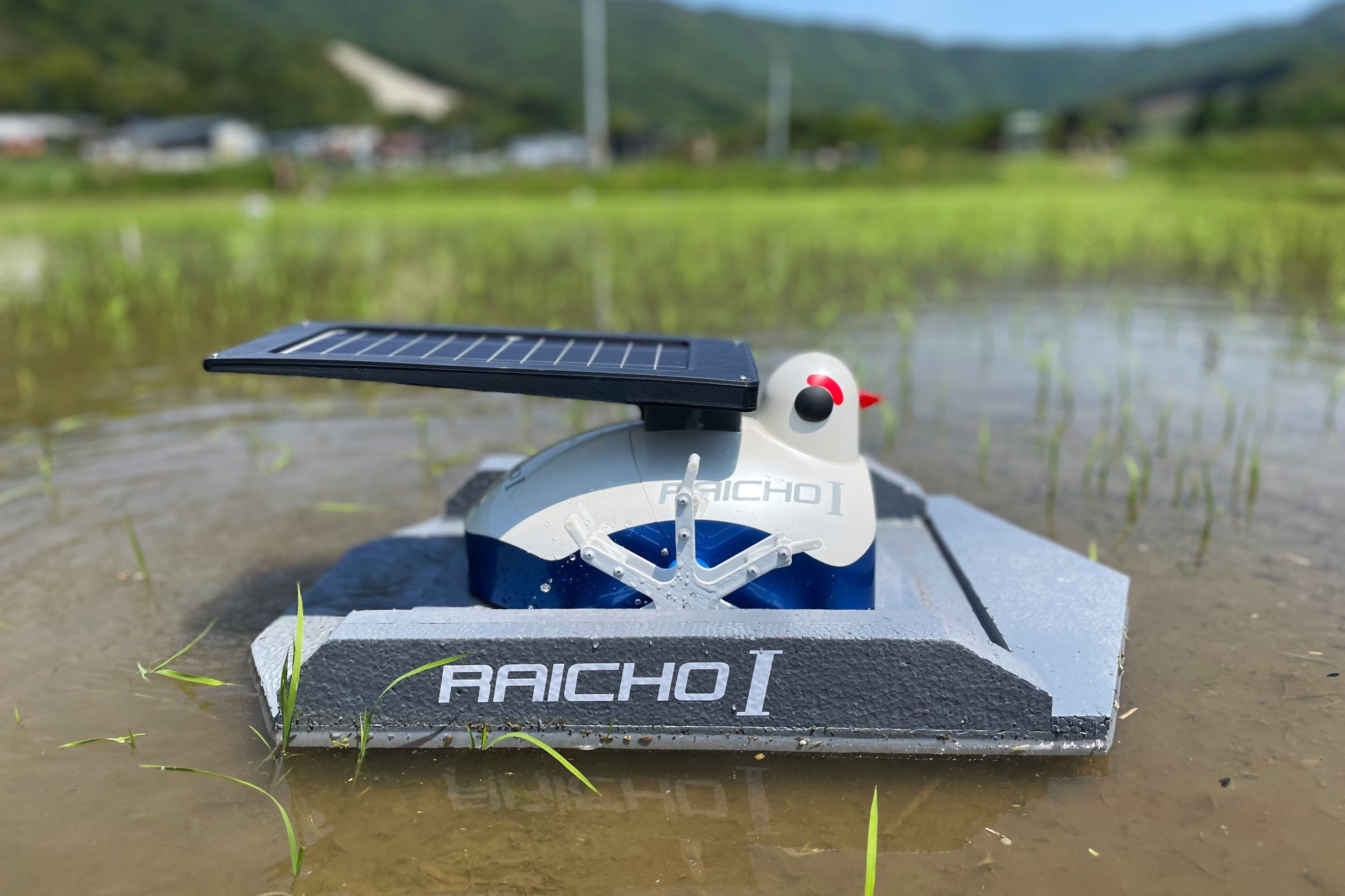 農業用ロボット「雷鳥1号」は、棚田や小規模圃場など、農地や経営規模の大規模化が図りにくい中山間農地の稲作を維持するために、省力化を最優先として多少の収量低下は許容するコンセプトで開発したものです。展示している雷鳥1号は、足ヒレで水を濁らせ、雑草の光合成を抑えることで、水田内の雑草繁茂を抑える雑草抑制モデルと、播種(種まき)や肥料・農薬散布を行うことができる播種対応モデルです。ソーラーパネルで発電し、日照があるときに稼働します。