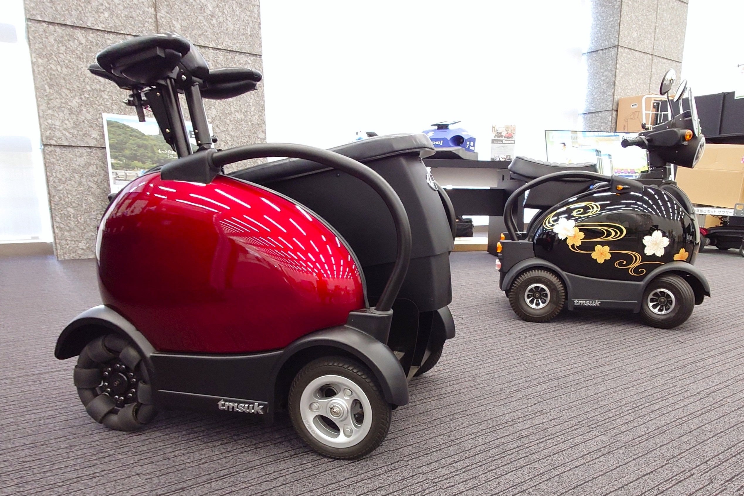 モビリティ型ロボット「RODEM」は、誰もが暮らしやすい社会を実現したいとの思いで開発されたユニバーサルデザインの”乗れるロボット”です。後ろから乗り込む形と、座面の上下機構により乗車が簡単にでき、⾛⾏時の⽬線が高く、歩⾏者と同じ⽬線で会話をすることが可能なのでRODEMに乗ったまま観光、レジでの支払いなどを行うことができます。今回「MIRAI ROBO SQUARE」に展示しているものは、免許不要で時速6kmで走行可能なスタンダードモデルと、屋外での活用に特化して最高速度を12km/hに向上し、ボディに漆塗り蒔絵加工を施した特別モデル(区分:ミニカー)です。