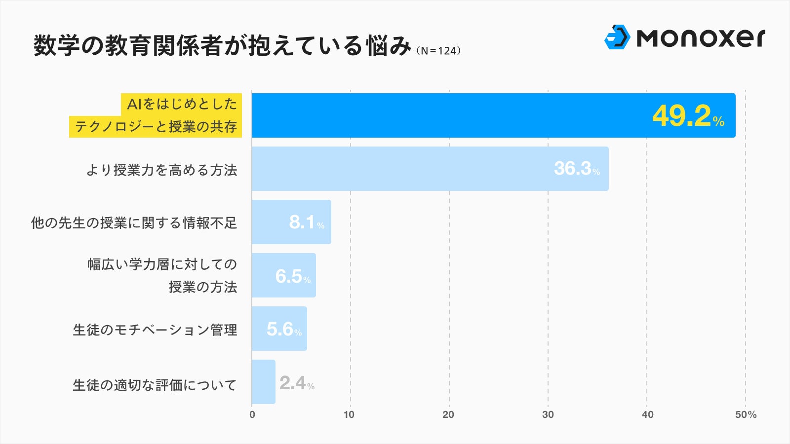 セミナー参加者のうち、124名を対象に「数学の指導に関して悩んでいること」についてアンケート調査を実施しました。その結果、約半数の49.2%が「AIをはじめとしたテクノロジーと授業の共存」という回答となりました。
