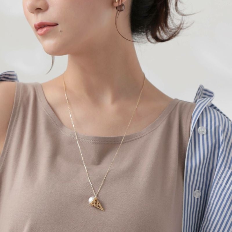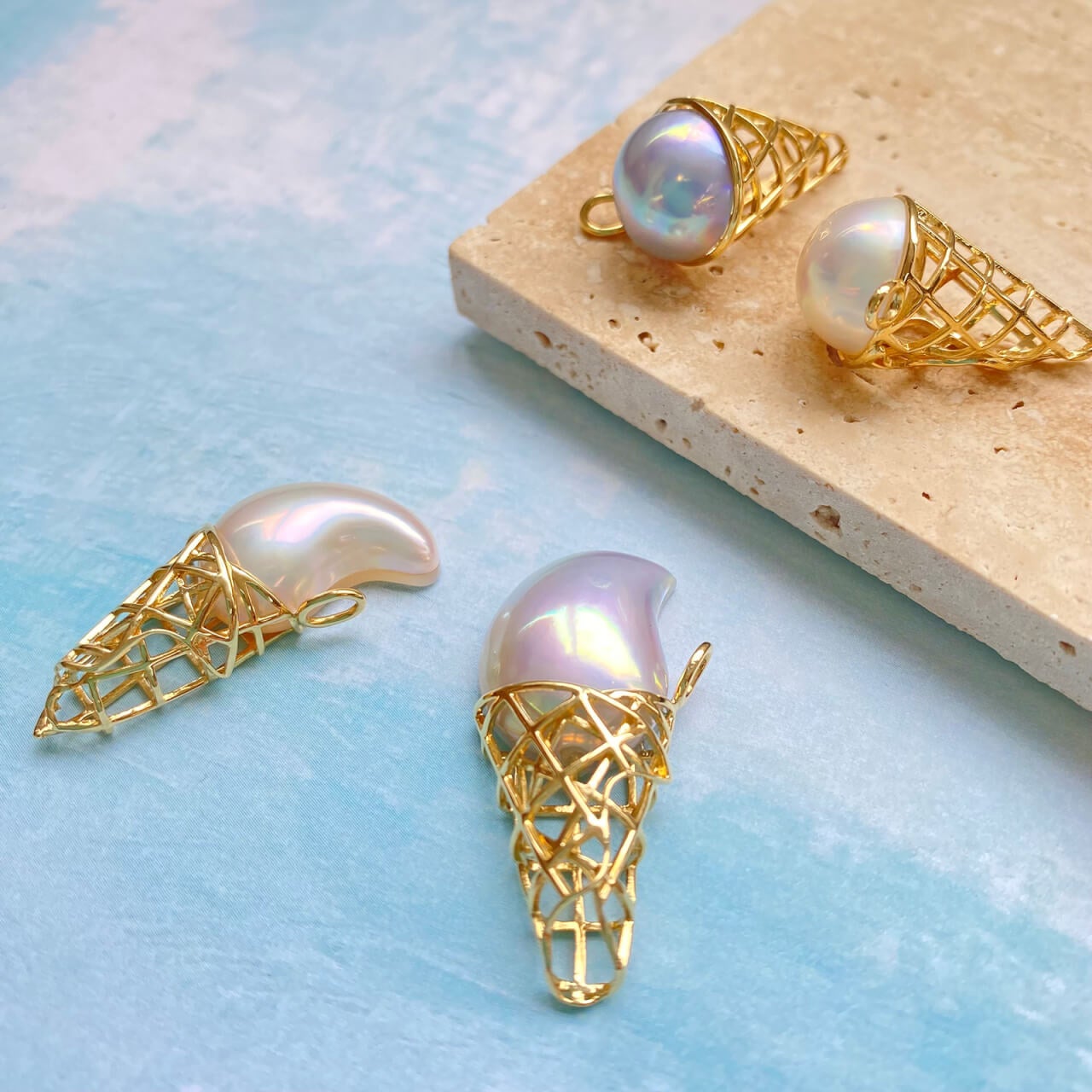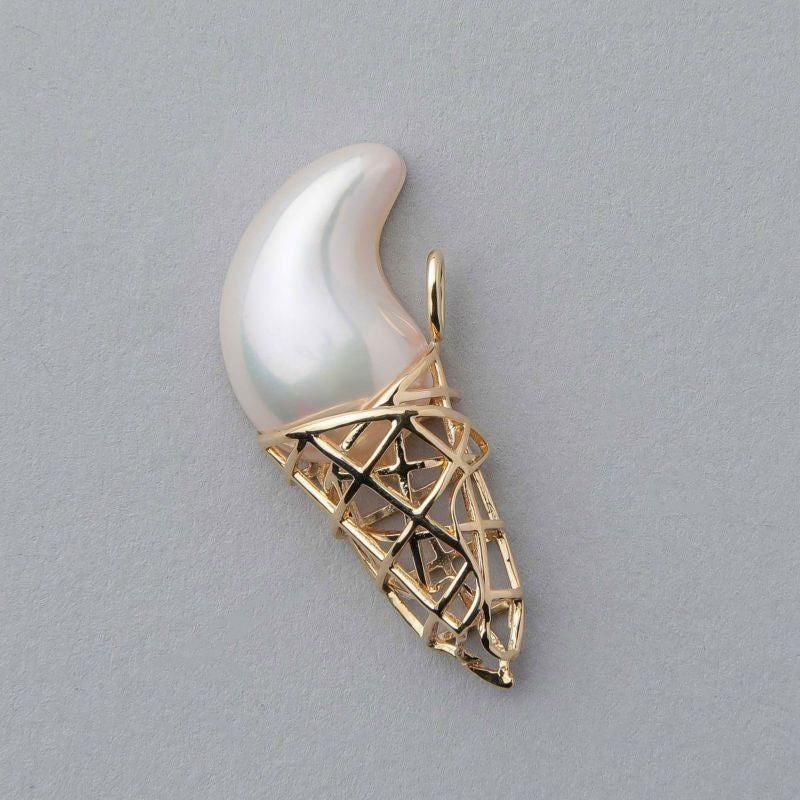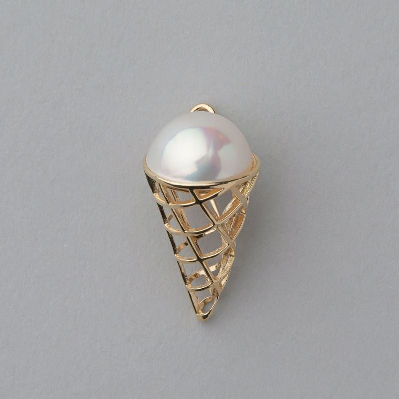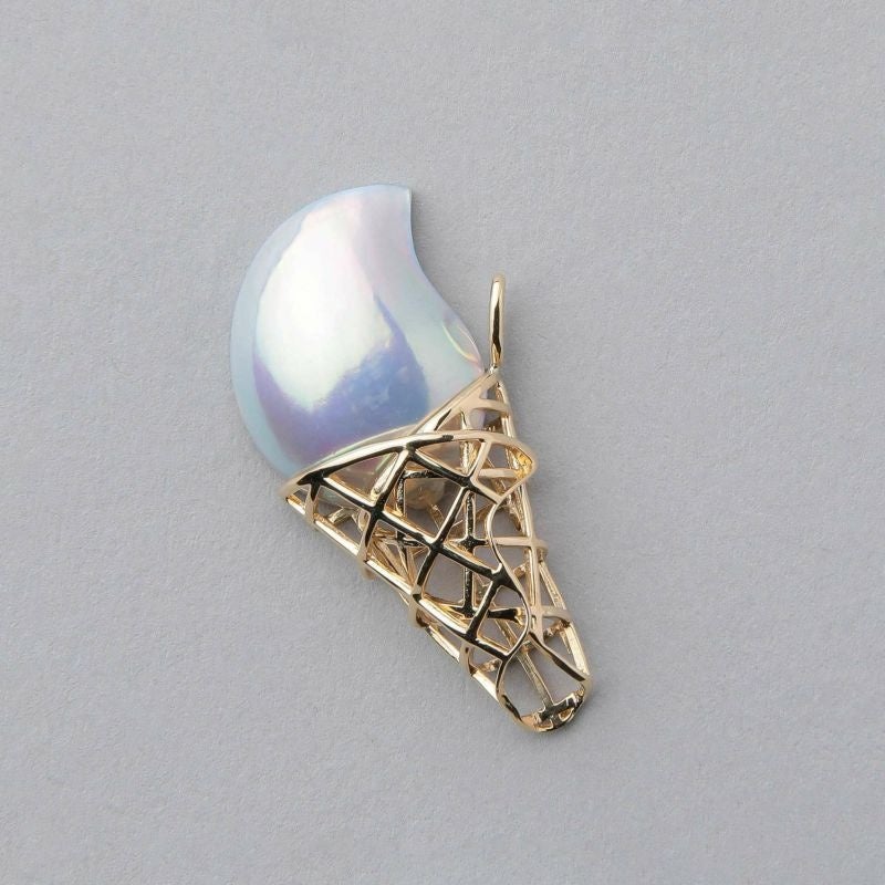 イエローゴールドでワッフルコーンを、照りと干渉色が美しいマベパールでクリームを表現しており、