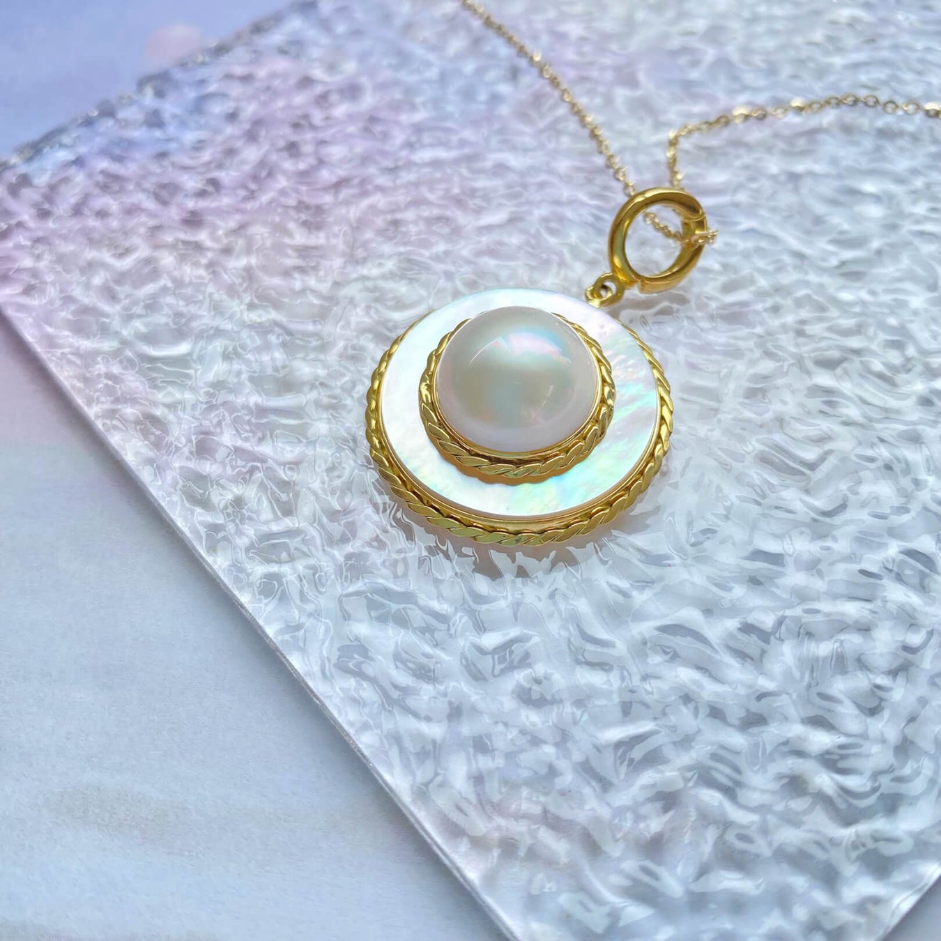 マベ貝から生まれる半円の真珠、マベパール。貝の内側に張り付くようにできるため半円のかたちをしています。 アコヤ真珠が “月の雫” と称されるのに対し、マベ真珠は “太陽の光” と称されます。 母貝の虹色の美しさは格別であり “世界で最も美しい真珠貝” と言われています。 その輝きは千差万別、ピンクやグリーンに輝くものもあれば、孔雀の羽のように妖艶に輝くもの、 朝焼けのような美しいブルーのものなど 多彩なカラーバリエーションをもつ、とても美しく稀少な真珠です。