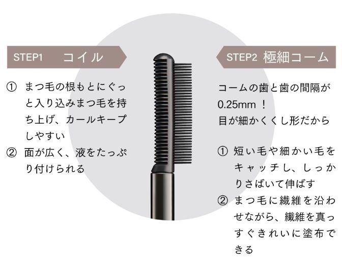 ー液含みが良くまつ毛にしっかり液を塗布できるコイルと、短い毛もキャッチしながらさばいてのばすコームのW使いで、ダマにならず毛が自然に増えたような美しい仕上がりを実現。