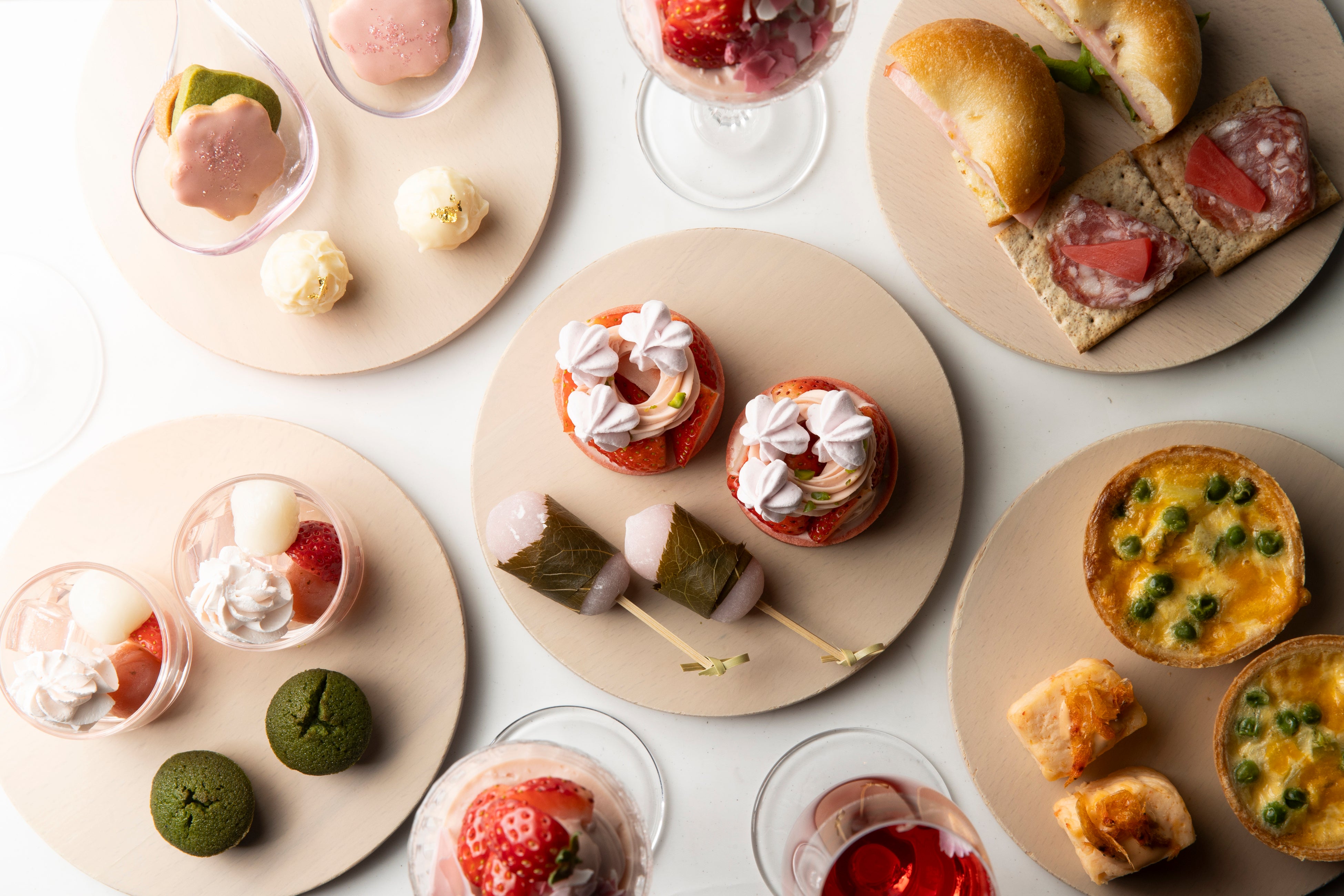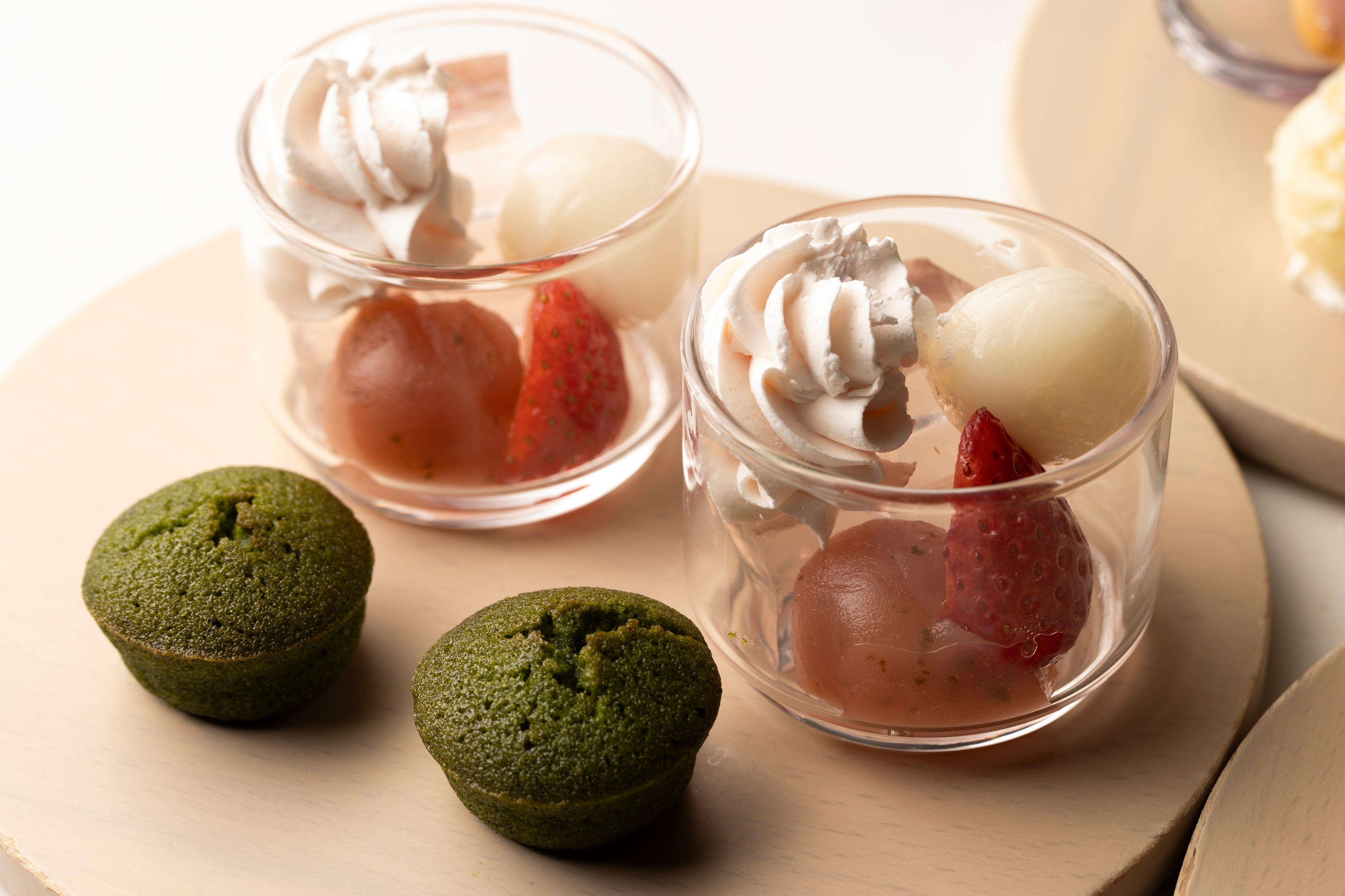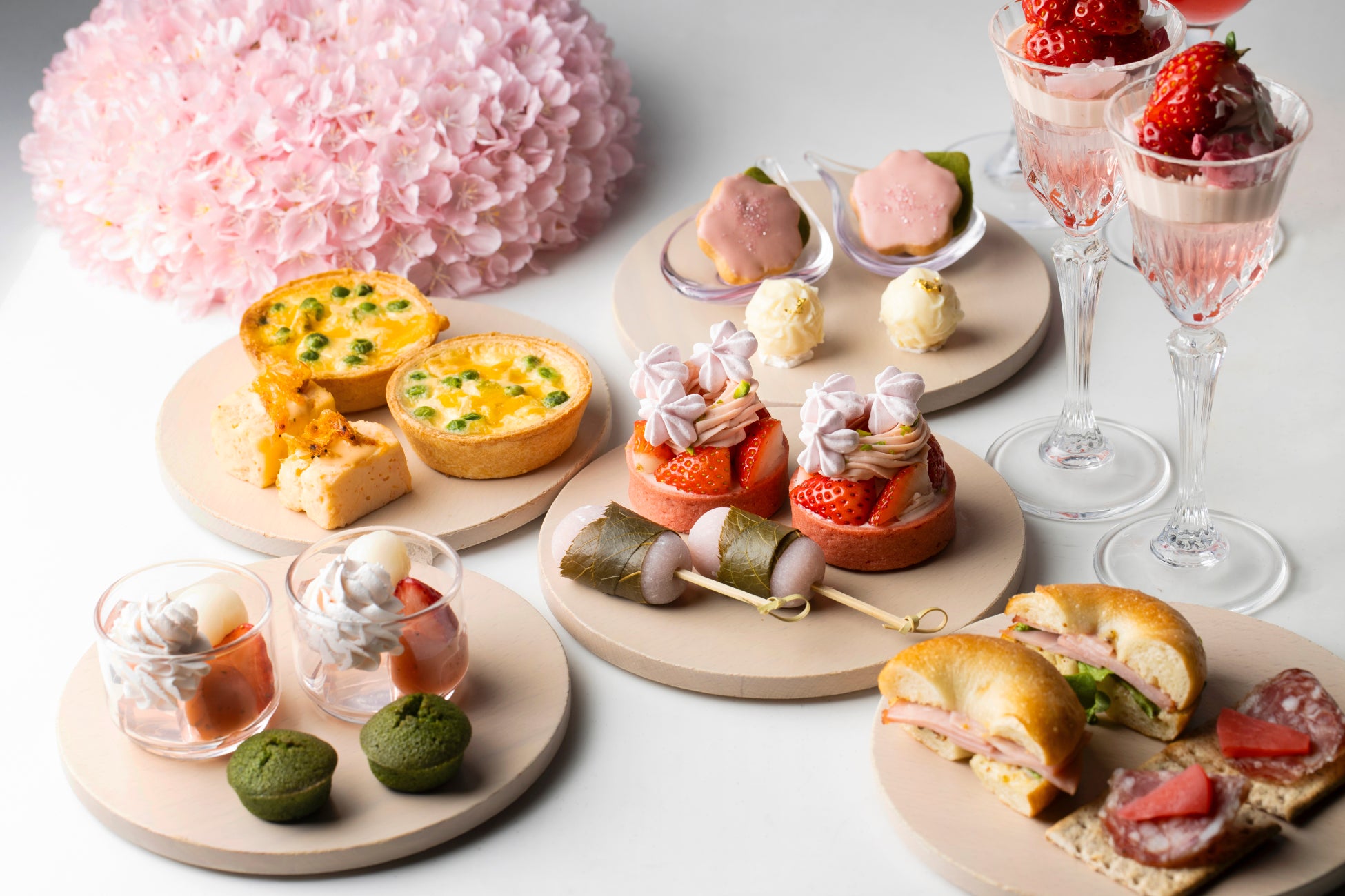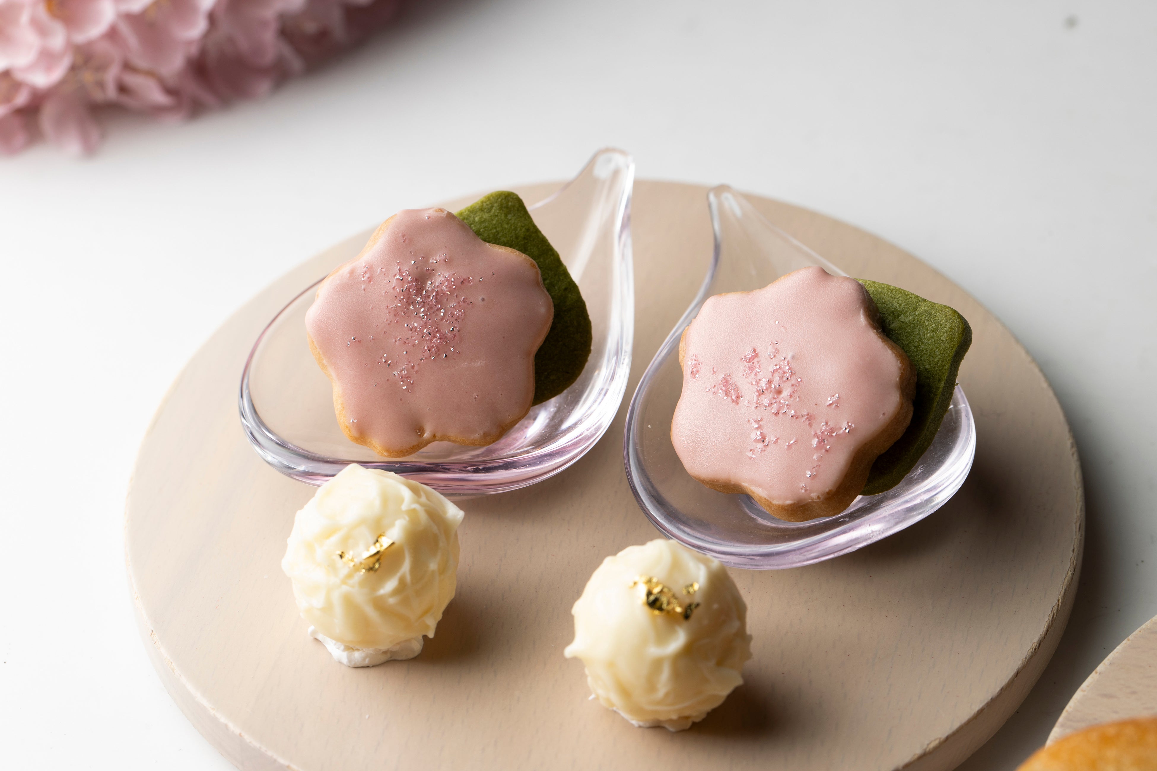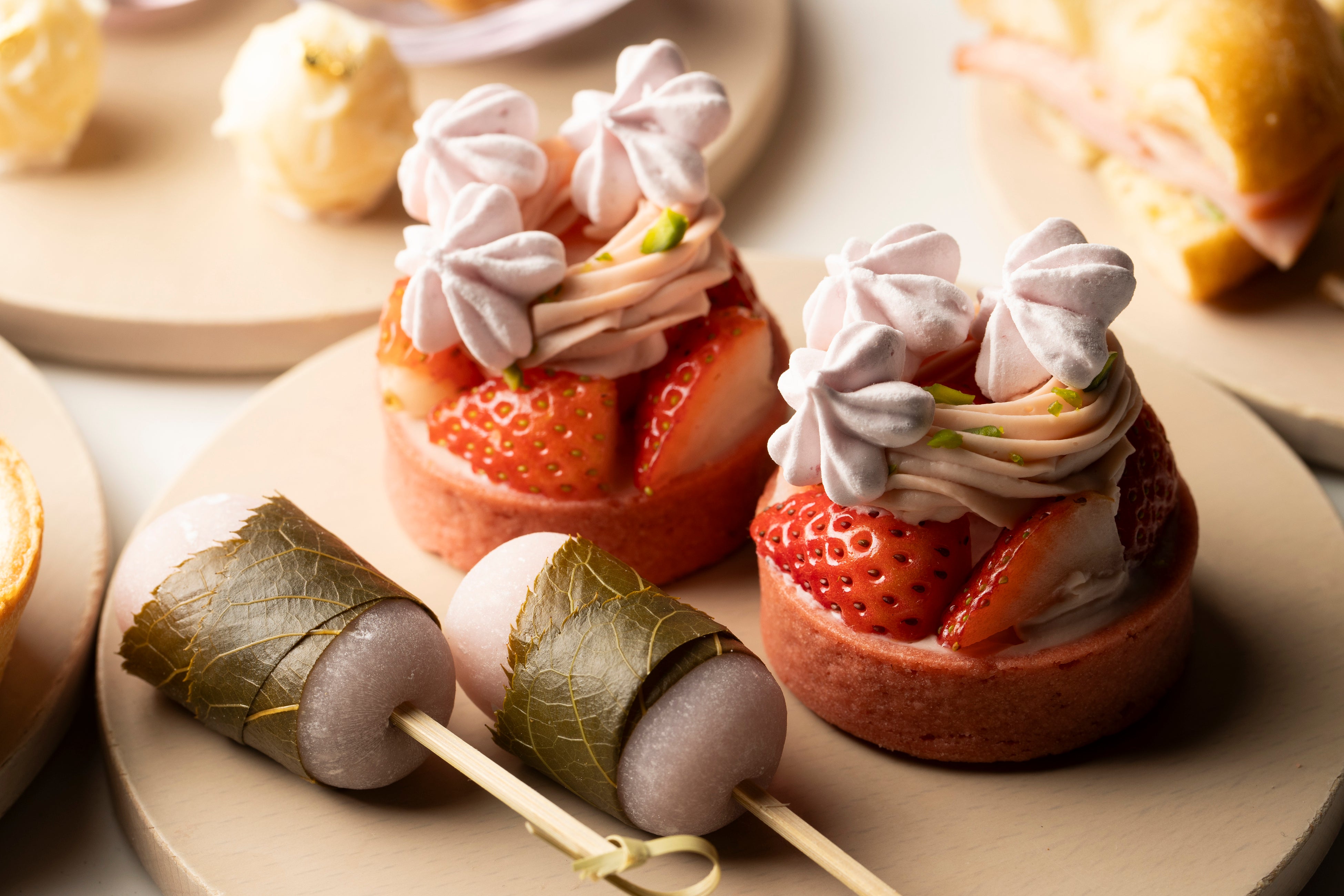 デザートは、国産の桜や京都の宇治抹茶などを使用したちょっぴり“和”テイストな8種類をご用意しました。思わず目を引くのは「桜と抹茶のタルト」。抹茶のチョコレートガナッシュの上に桜入りのクリーム、さらに苺と桜モチーフのメレンゲクッキーを添えた一品です。他にも可愛らしい「桜と抹茶、焙じ茶のクッキー」に「桜の串団子」など、和紅茶や緑茶とも相性抜群の上品な美味しさに仕上げました。