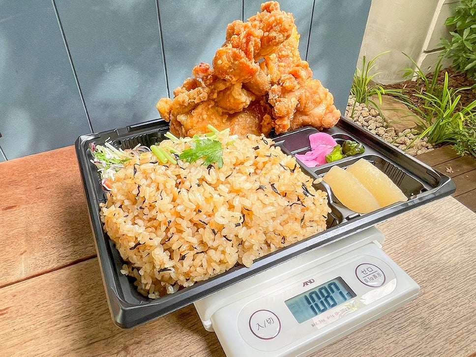 からあげ弁当(ご飯大盛り・からあげ追加)1300円(普通盛りは大ぶりなからあげ3つで800円)/西京屋 周