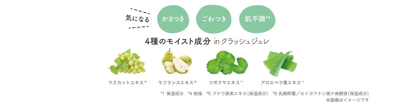 果実由来のモイスト成分*1が、かさつき・ごわつき・肌不調*4にアプローチして、みずみずしいなめらかうるおい肌へ導きます。