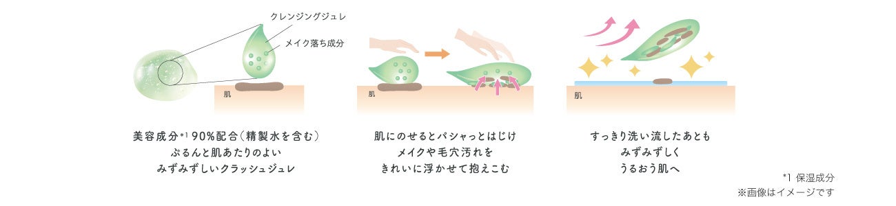 みずみずしいジュレが肌の上でパシャっとはじけて、肌に密着し、するするなじんでメイクや汚れを素早く落とします。
