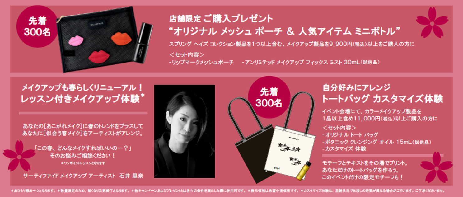 メイクアップ体験やご購入いただいた方に、その場でカスタマイズできるオリジナルトートバッグのプレゼントなどの限定コンテンツをご準備してお待ちしております。