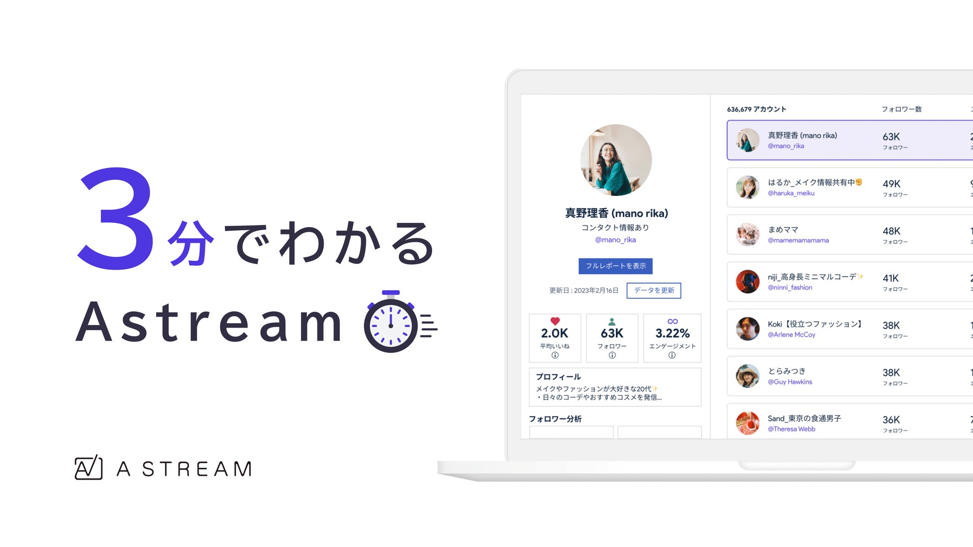 Astreamはこれまで取得不可能であった、インフルエンサーのフォロワーの”興味関心”や”ブランドの好み”といったサイコグラフィック情報の分析を可能にする、次世代SNSマーケティングツールです。