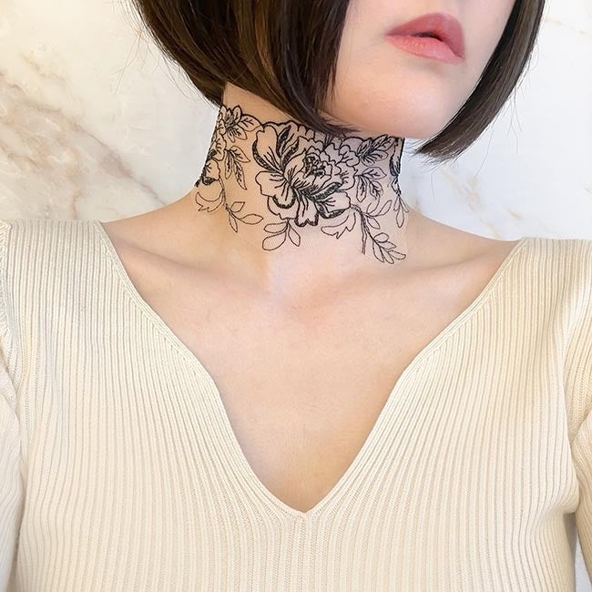 まるでタトゥーを入れているかのように見えるレースチョーカー。幅広い花柄のレースが目をひきます。ちょっとしたイメチェンや仮装、パーティーなどにもぴったり。タトゥーを入れずとも、レースチョーカーならアクセサリーとして気軽に取り入れられるのも嬉しいポイントです。