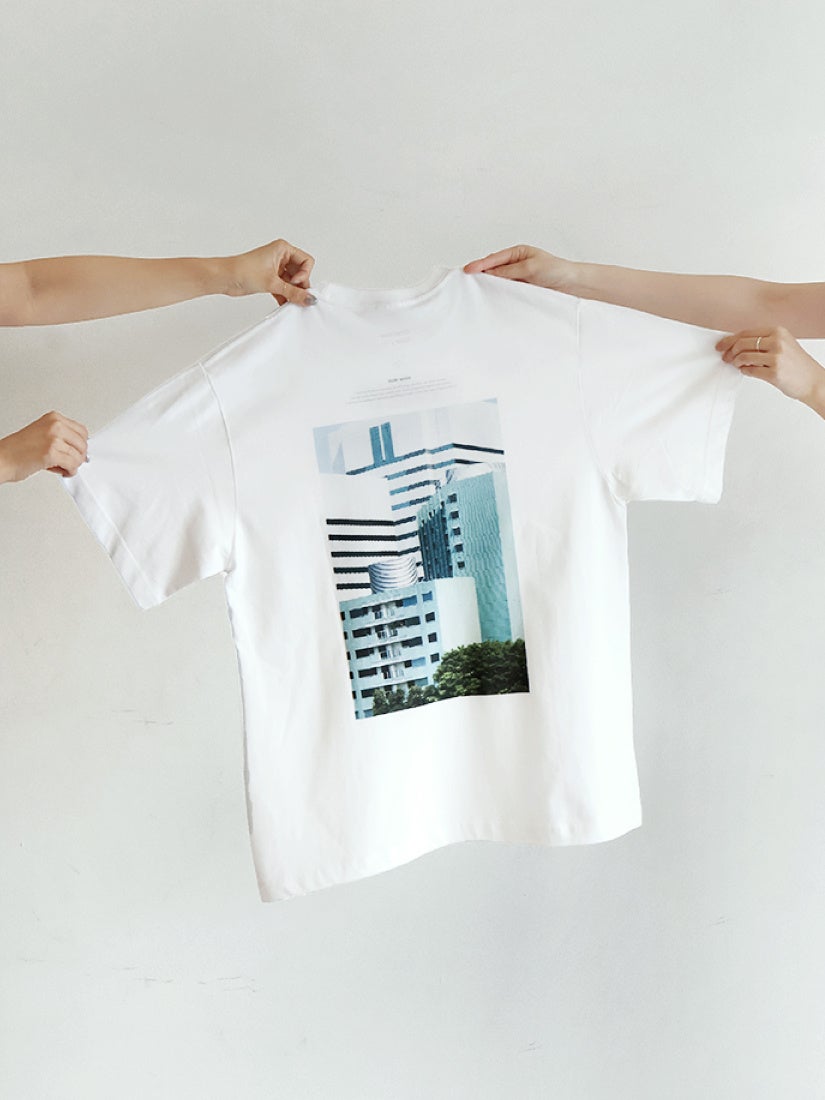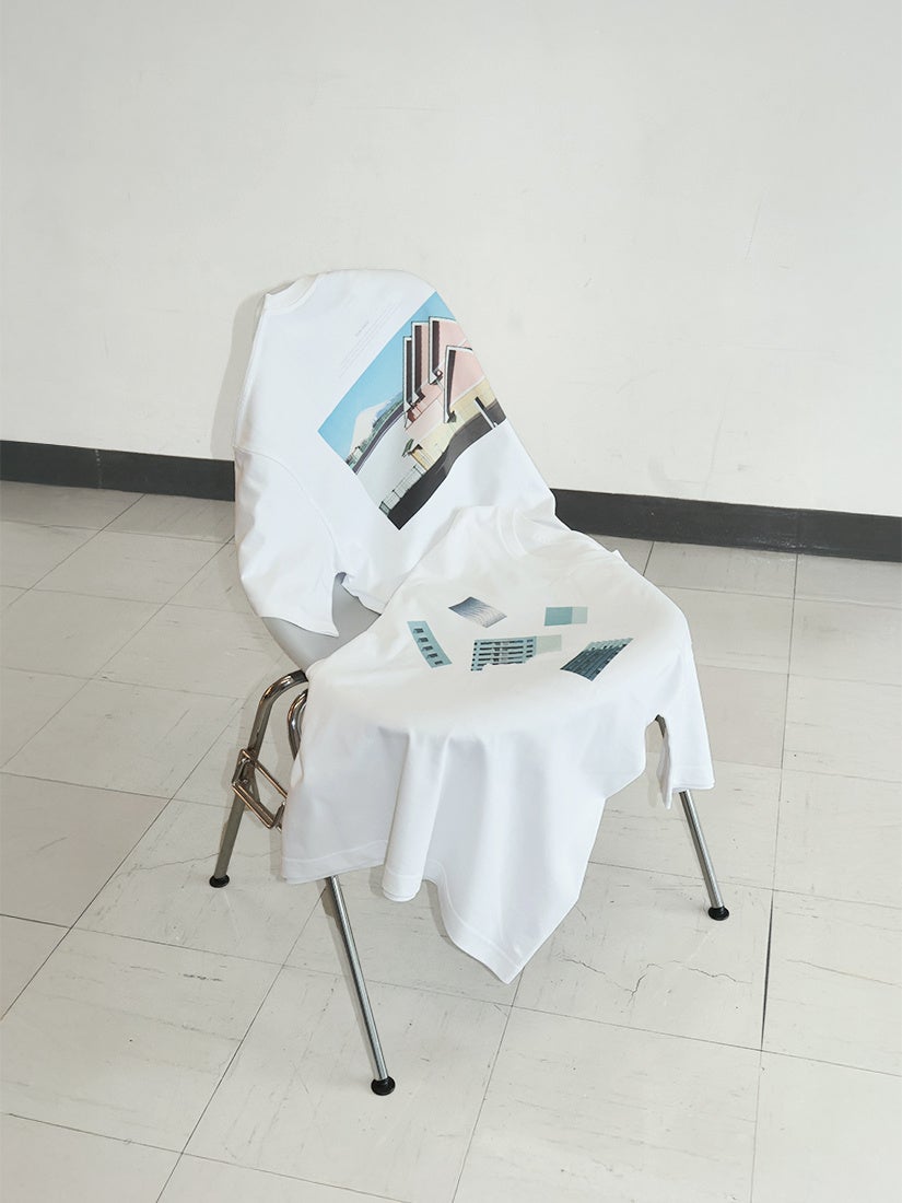 ノイズを消した都市の風景は、写真という枠を超えて静かな絵画性を帯びていきます。アザワイズギャラリーとして、今回Tシャツに落とし込むに辺り、その作品の一部を抜き出し、色面構成のイメージで構成や質感の美を再構築することで、布の上に別の視点のアートとしてデザインをしました。