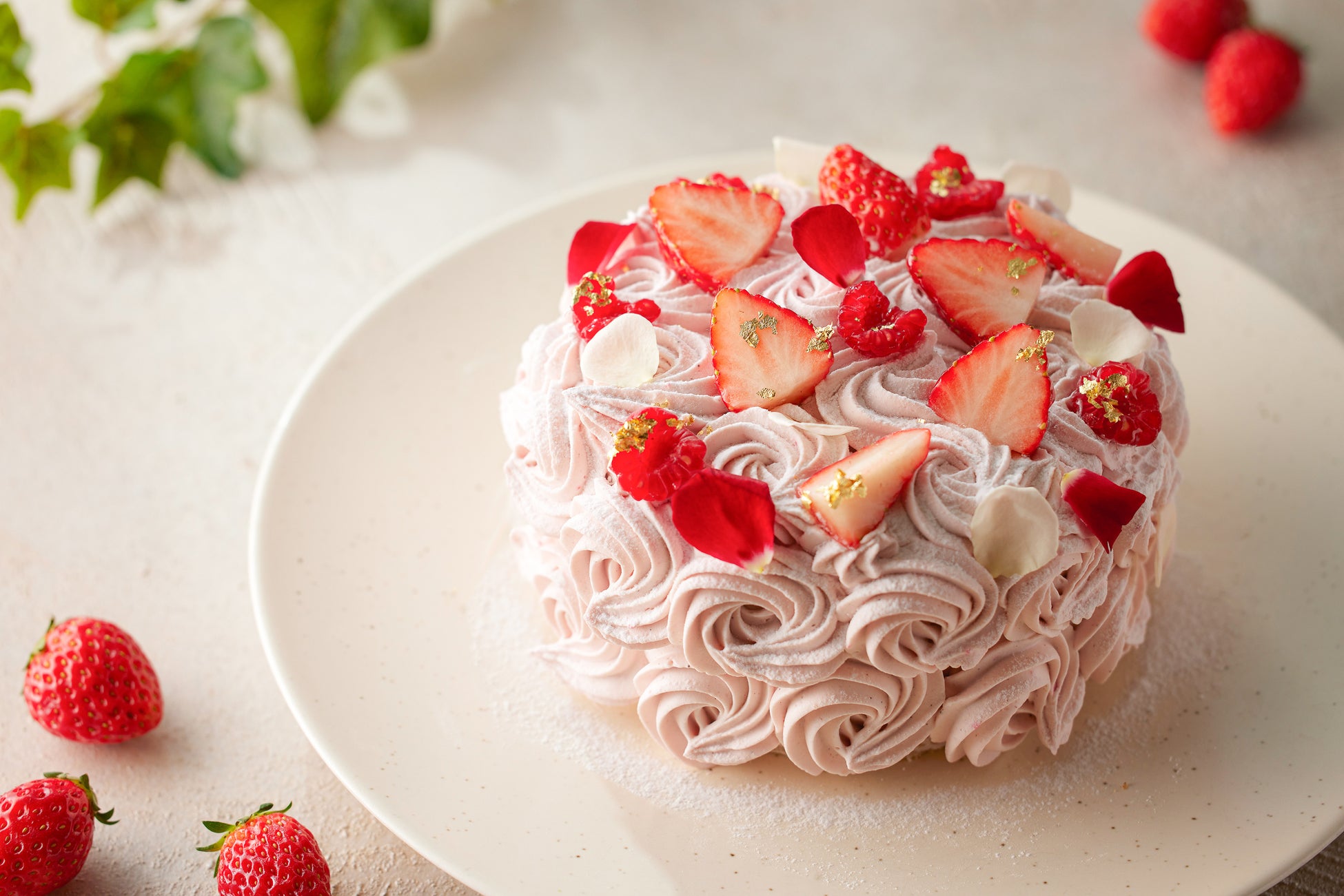 花束のように重なるロゼカラーのホイップクリームと紅茶とバラが奏でる華やかなハーモニー「紅茶とバラのストロベリーショートケーキ」が期間限定で登場!