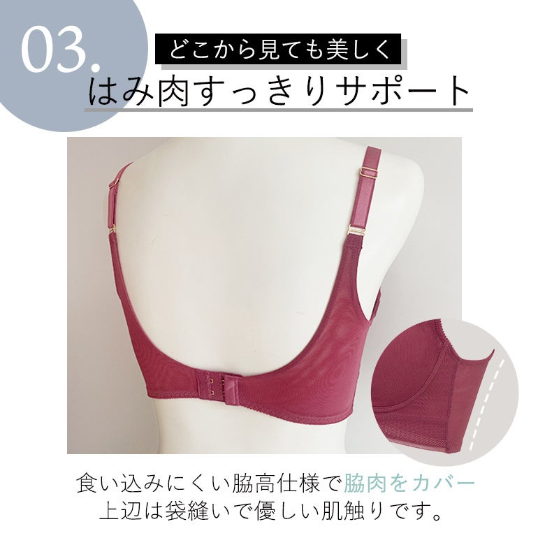カップ表のレースにもモールド加工を施しているため、アウターに響きづらく、夏の時期もさらっと着こなせる実用性の高さが魅力です。また、背面は脇高デザインのUバックになっており、気になるお肉をカバーするとともに、トレンドの背中が空いたお洋服とのコーディネートを楽しんでいただけます。
