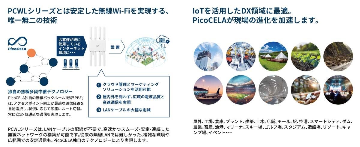 PicoCELAは、世界最高レベルの無線メッシュ技術で、有線LANの設置が困難な場所や一時的な利用など、様々な環境で安定した大規模Wi-Fi空間を構築するソリューションを提供しています。エッジコンピュータと無線メッシュネットワークを融合させたユニークな技術で、国内外の工場、倉庫、プラント、建設現場、商業施設、公共インフラなど、幅広い分野で活用されています。PicoCELAは、無線技術を通じて、より自由で、より安全なコミュニケーション基盤を創造し、持続可能な社会の発展に貢献してまいります。